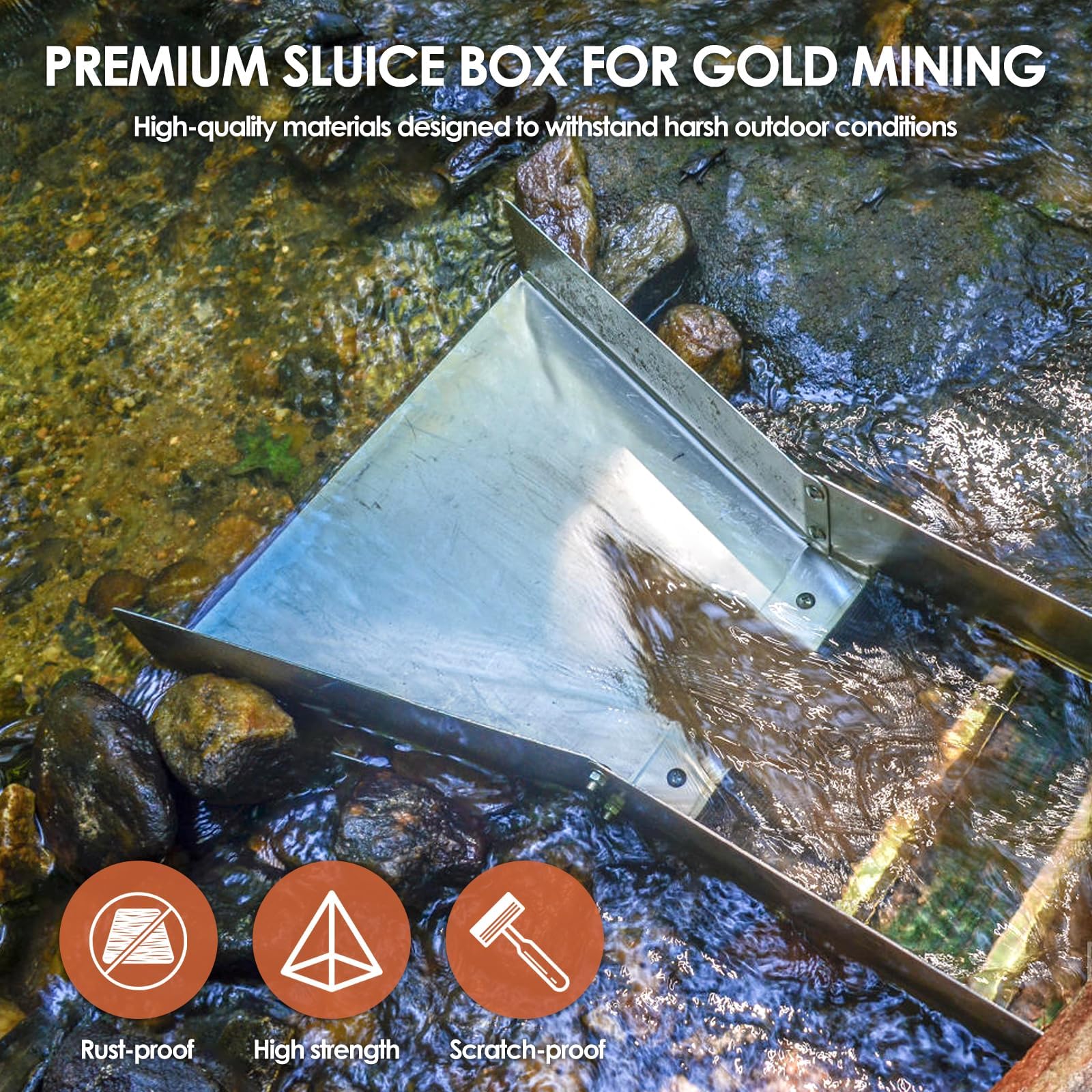 - Premium Aluminum Alloy: The compact 50-inch gold mining equipment is made from premium quality aluminum alloy, which is lightweight, rust resistant, sturdy, and can be used for the long term. Thegold prospecting equipment is easy to carry and resistant to harsh outdoor conditions. With superior scratch resistance and durability, this gold sluice is the ideal choice for gold prospectors
