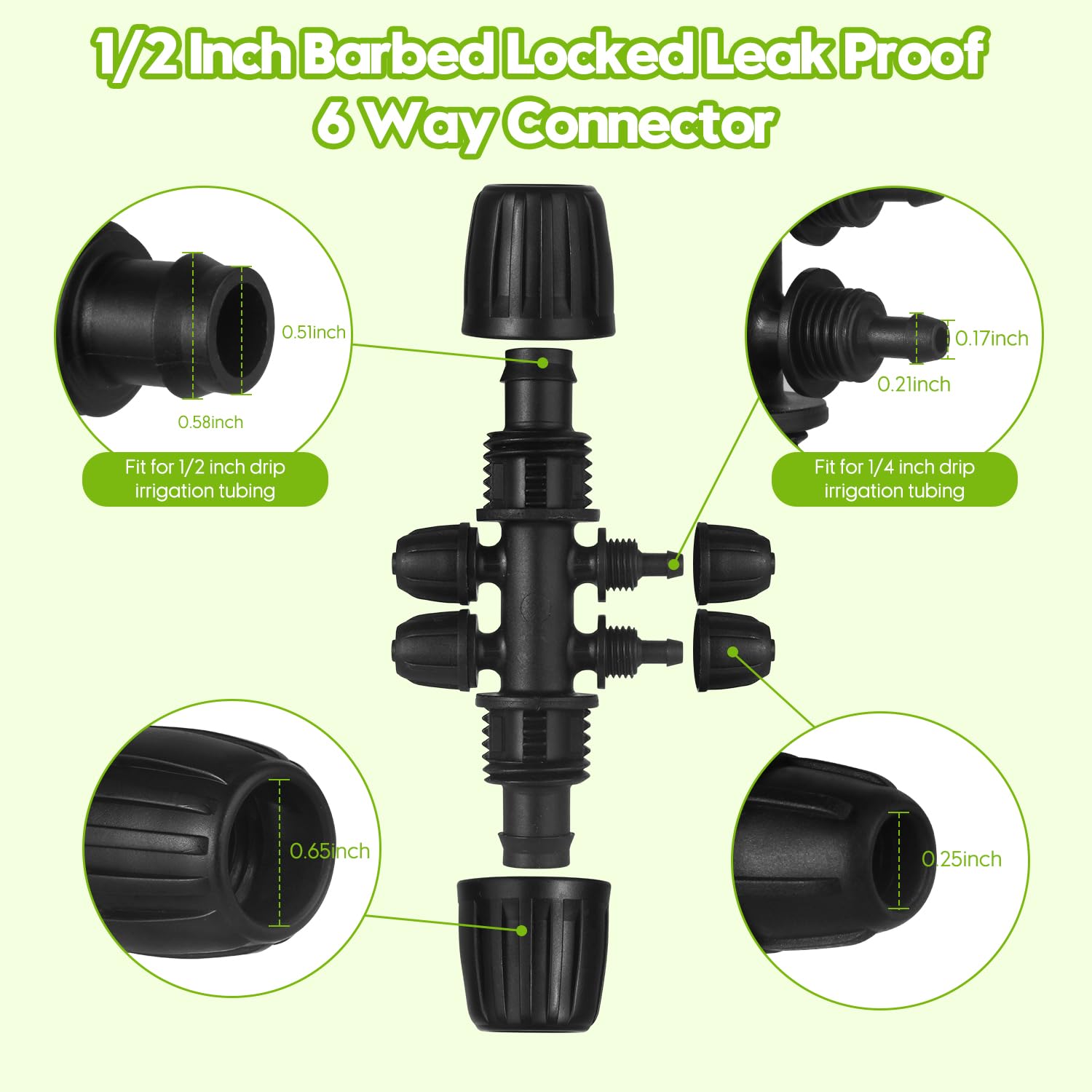 - 【1/2 Inch Irrigation Tubing Kit】Contains a 50ft/15m 1/2 irrigation tubing, a 1/2" locked barbed tee fitting and 4 pcs barbed locked 6 way 1/2" to 1/4" connectors. You can cut the 1/2 drip irrigation tubing as needed and use the irrigation tubing connectors to irrigate the plants automatically. Create an efficient and practical small drip irrigation system, garden watering system, micro sprinkler system for yourselves.