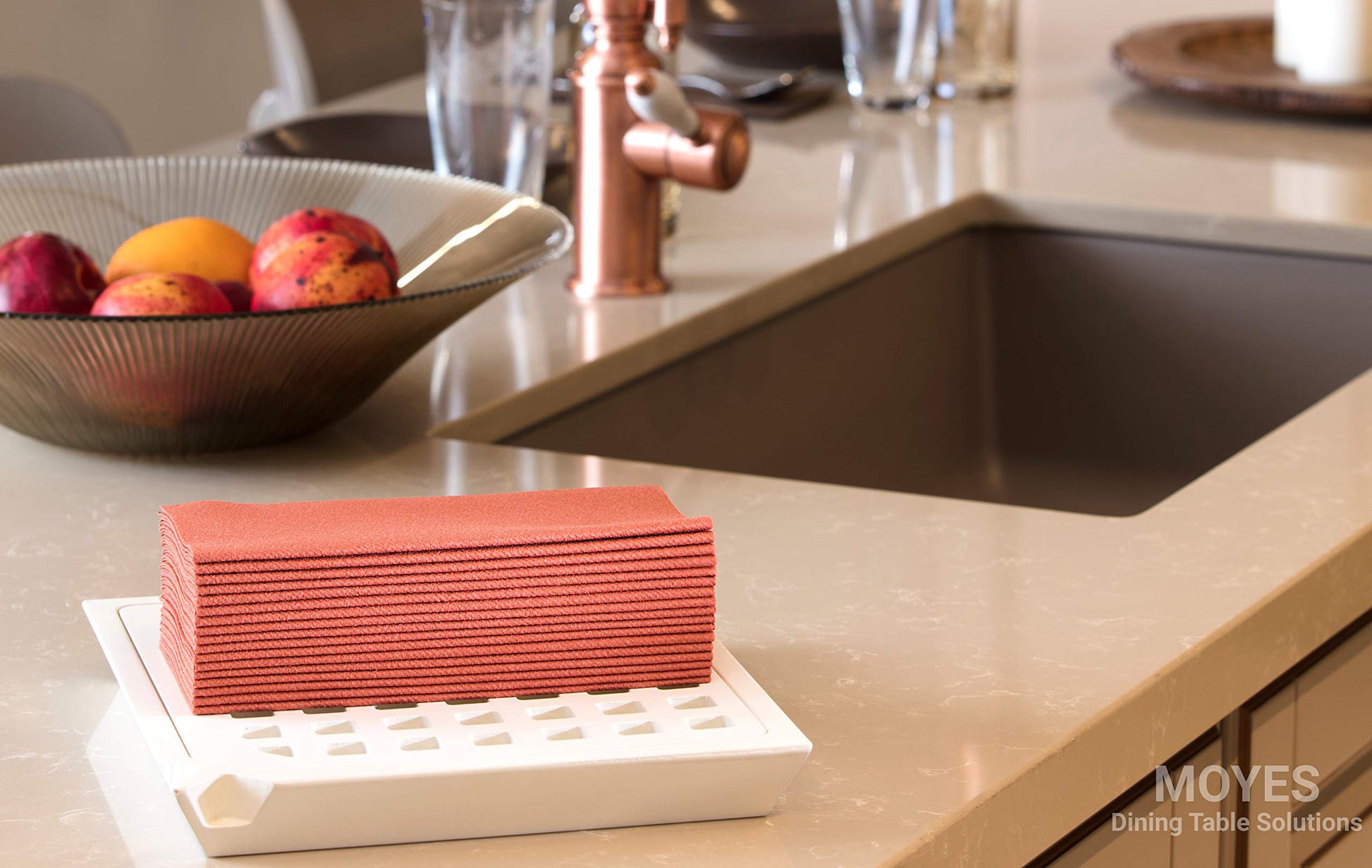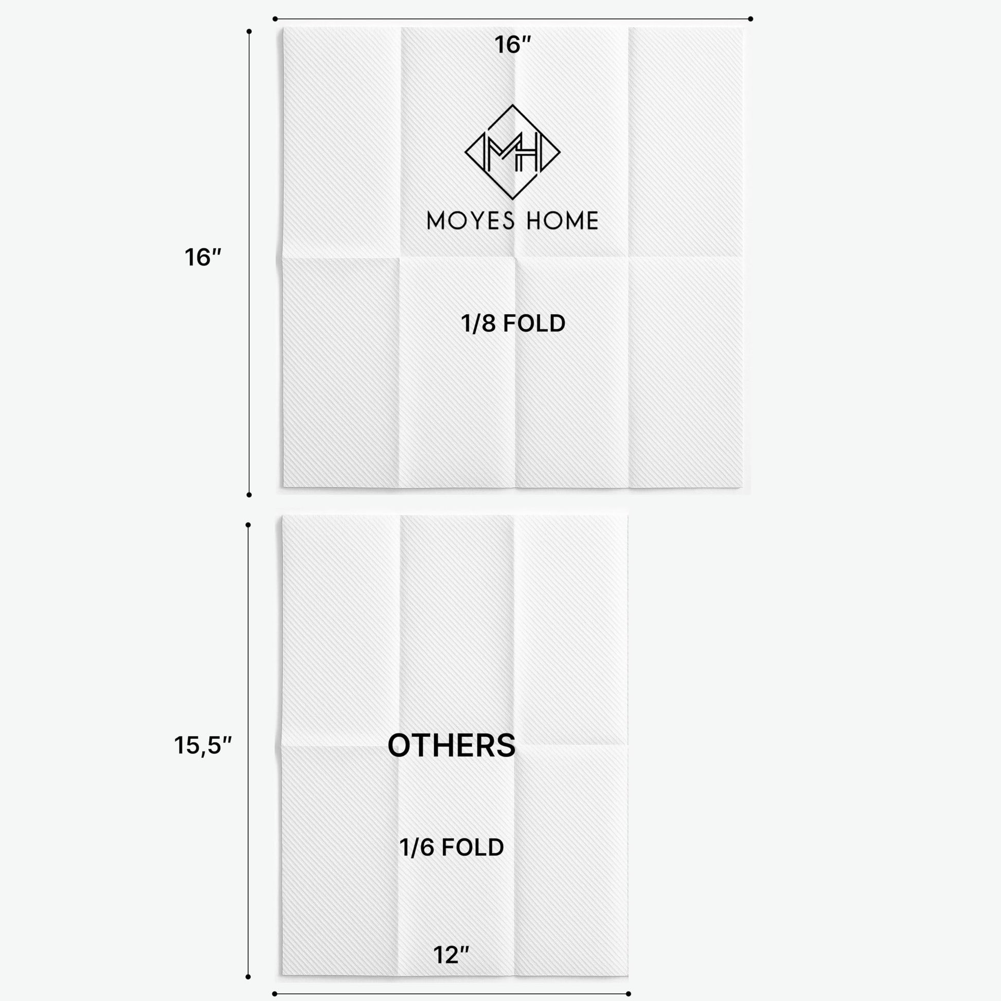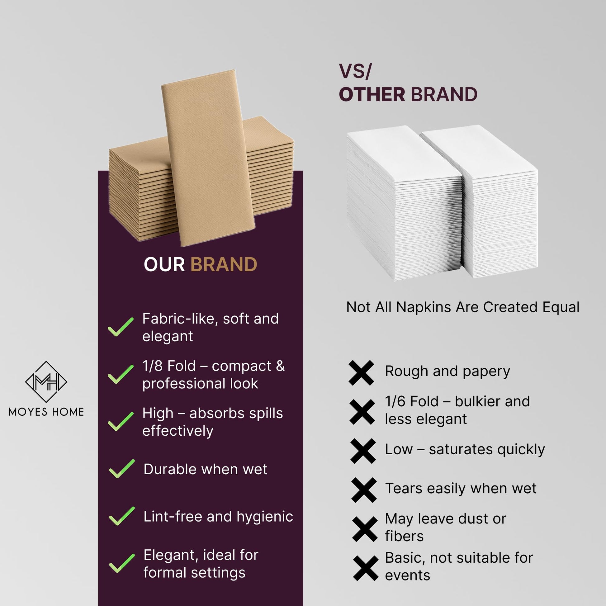 - DURABLE and STRONG -Moyes Home Air Laid paper napkins are particularly tear-resistant, extremely absorbent, and so the ideal alternative to textile napkin. They are extremely strong and perfectly durable- It`s hard to find strong and high quality paper napkins that are thick enough without using more than one but these paper napkins can be rinsed and reused even when it gets wet Airlaid napkins can absorb 6 times its own weight in liquid. EXCELLENCE and ELEGANT DESIGN- Non-linting - No threading