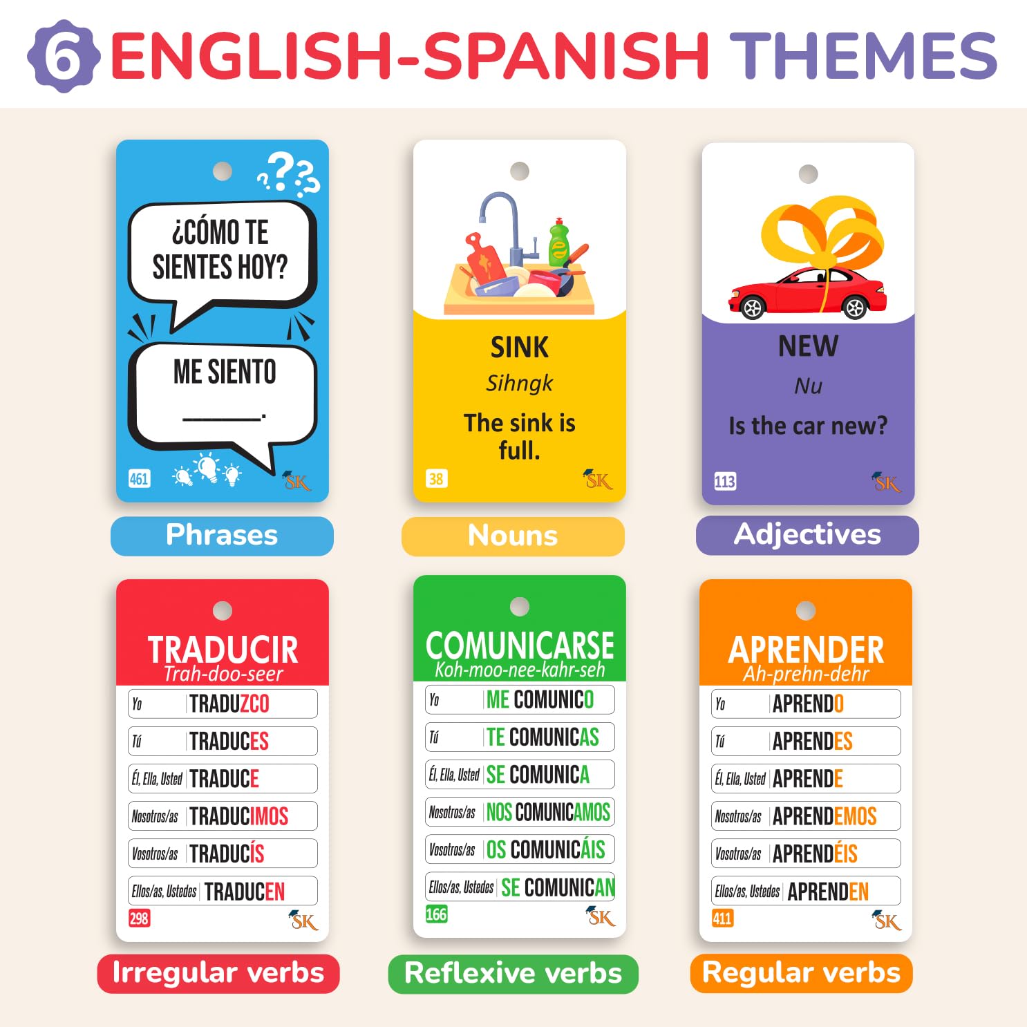 - 500+ Comprehensive Cards: Our English to Spanish flashcards for kids include 150 regular verbs, 100 irregular verbs, 50 reflexive verbs, nouns, adjectives, and practice cards. This Spanish learning for kids is ideal for beginners to intermediates.