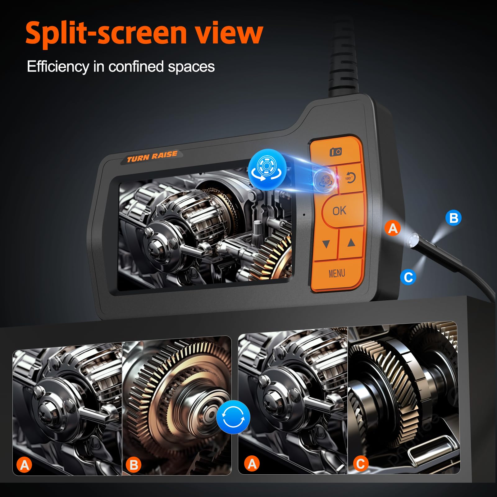 - Triple-Lens with Split Screen - Borescope camera with light offers direct front or two side views, hold the 180° flip button to switch between 5 viewing modes. Focal ranges of 1.9-4.7 in (front cam A), 1.2-3.1 in (side cam B), 0.8-2.4 inch (side cam C).