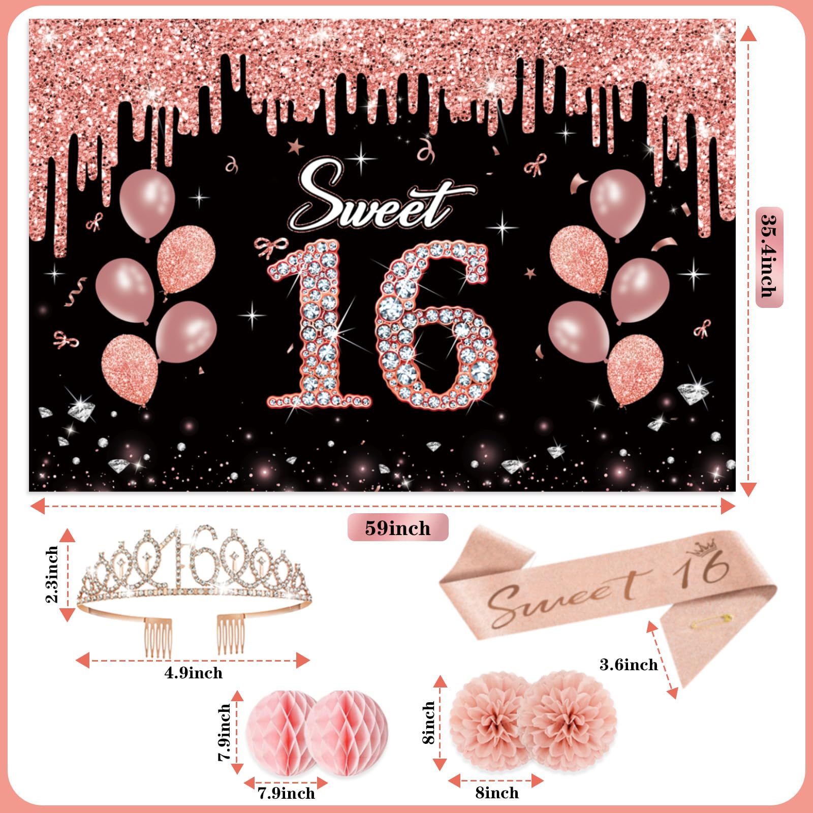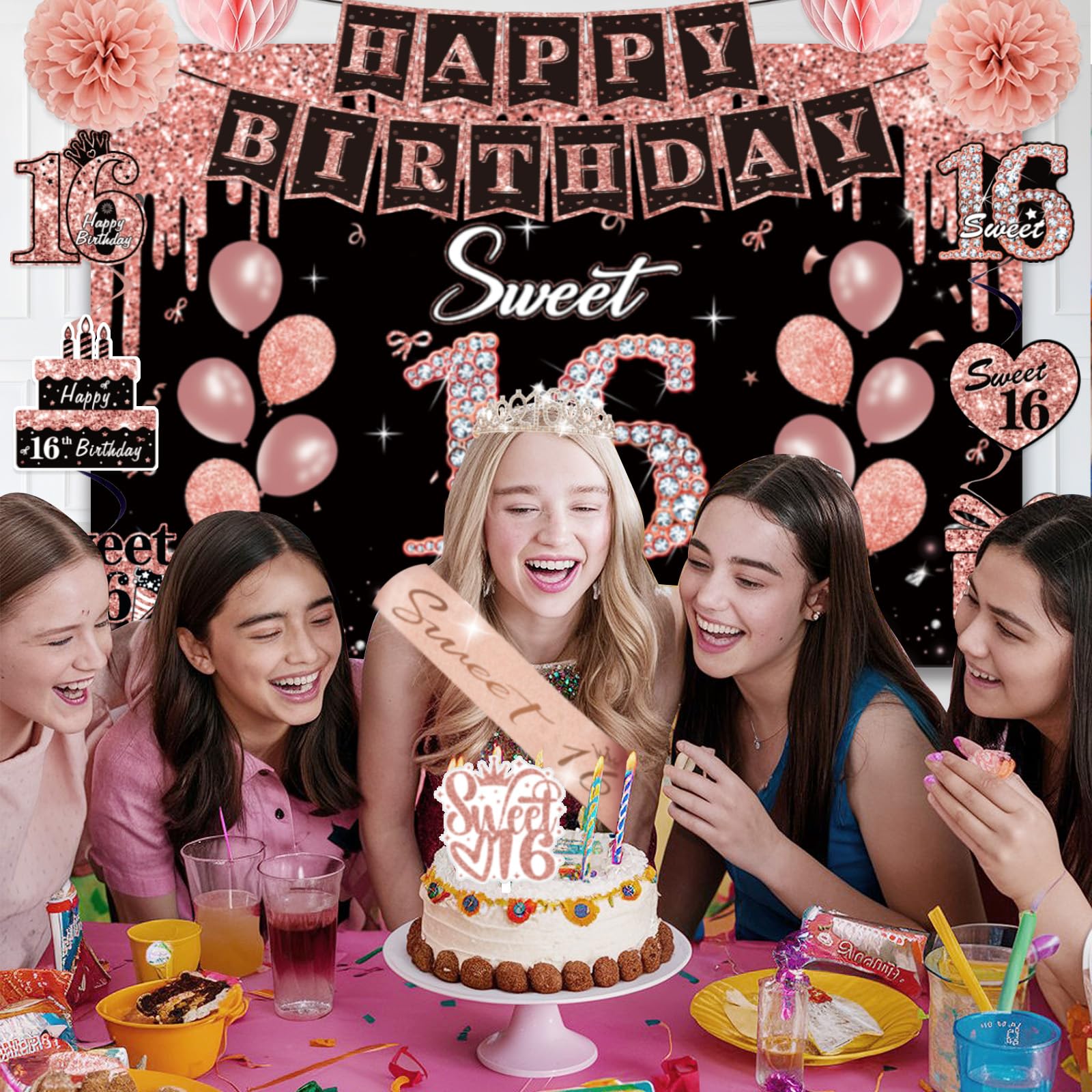 50PCS Sweet 16 Birthday Decorations for Girls, 16th Bady Crown and Sash Set, Rose Gold and Black Banner, Cake Topper, Balloons, Swirl, Pom Poms, Backdrop Decor, Happy Sixteen Party Supplies.