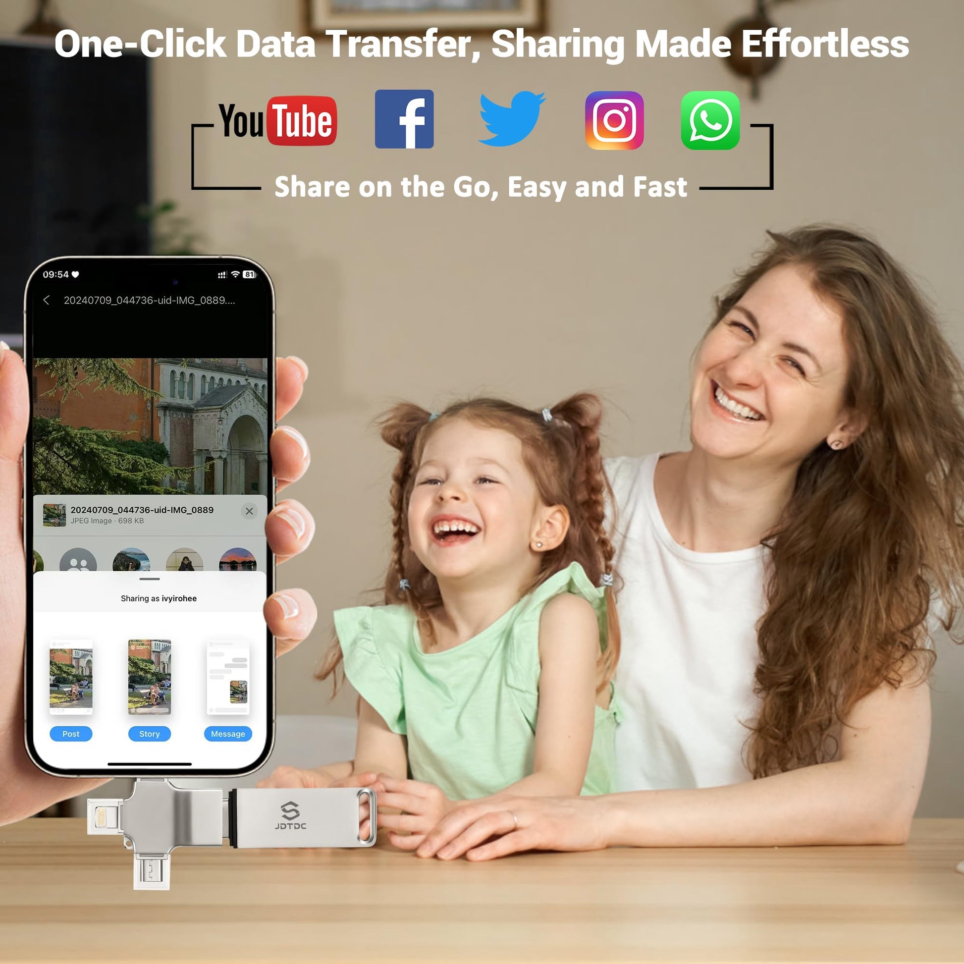 - đăDuplicate Detection & Seamless Sharingă This photo memory stick automatically detects new files, skips duplicates, and saves only fresh photos and videosâso no wasted space or manual sorting. Share directly from the iPhone flash drive to Instagram, Facebook, and more in seconds. Back up, save space, and share your best moments effortlessly from the photo backup storage device.
