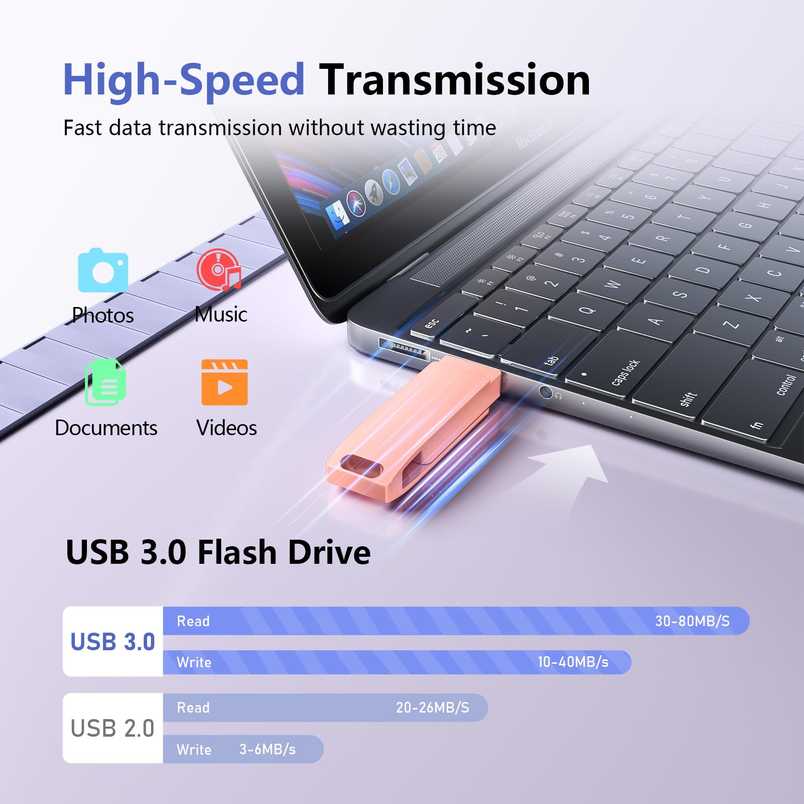 - 【High-speed USB Memory Stick】 This usb drive uses a USB 3.0 high-speed interface, allowing for quick recognition and stable file transfer upon insertion, freeing up storage space. The usb flash drive not only eliminates the hassle of carrying multiple data cables, but also solves the problem of insufficient storage capacity on mobile phones or tablets.