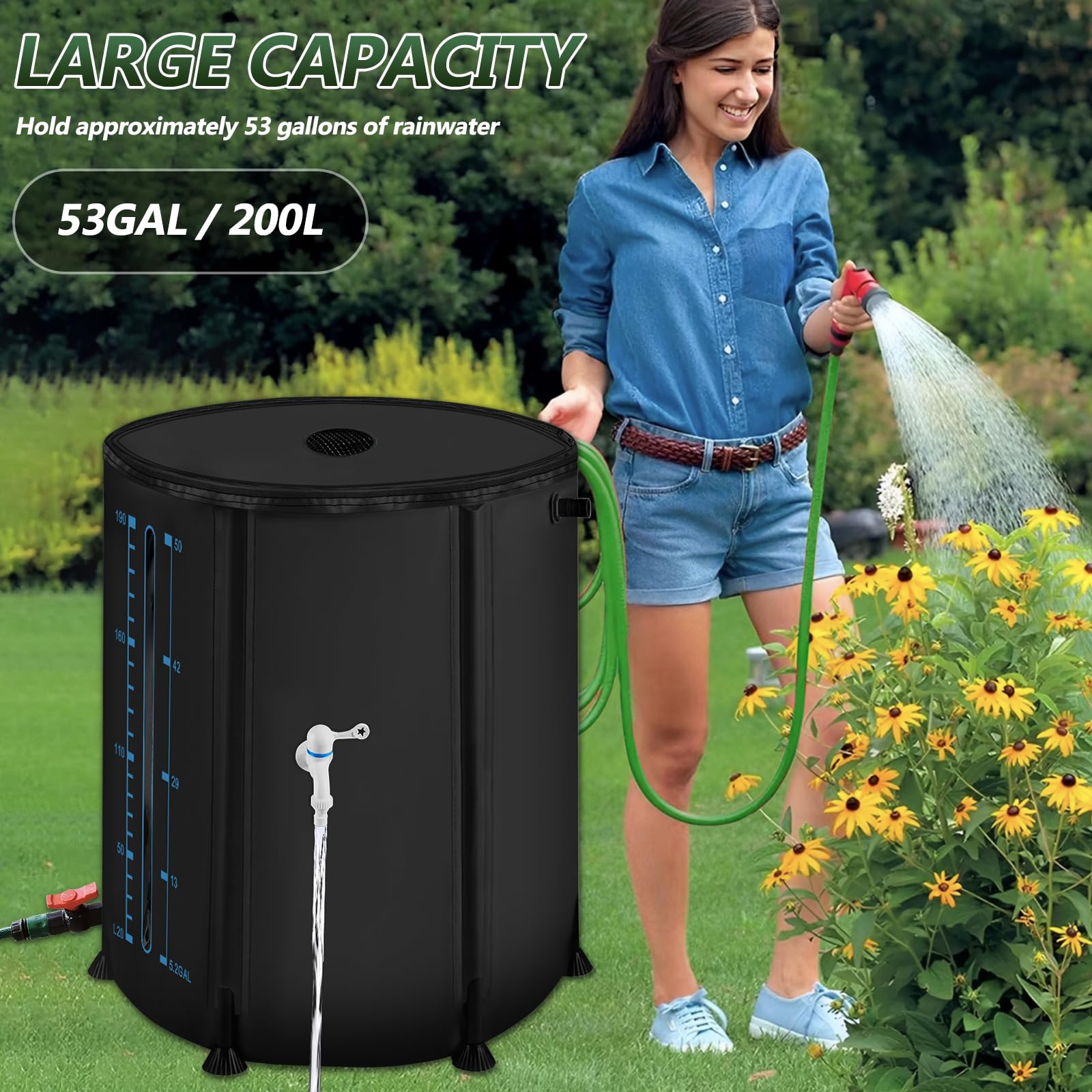 53Gallon/200L Rain Water Collection Barrel, Portable PVC Rain Barrels to Collect Rainwater from Gutter, Large Capacity Rainwater Collection System with Water Level for Garden Water Catcher, Black