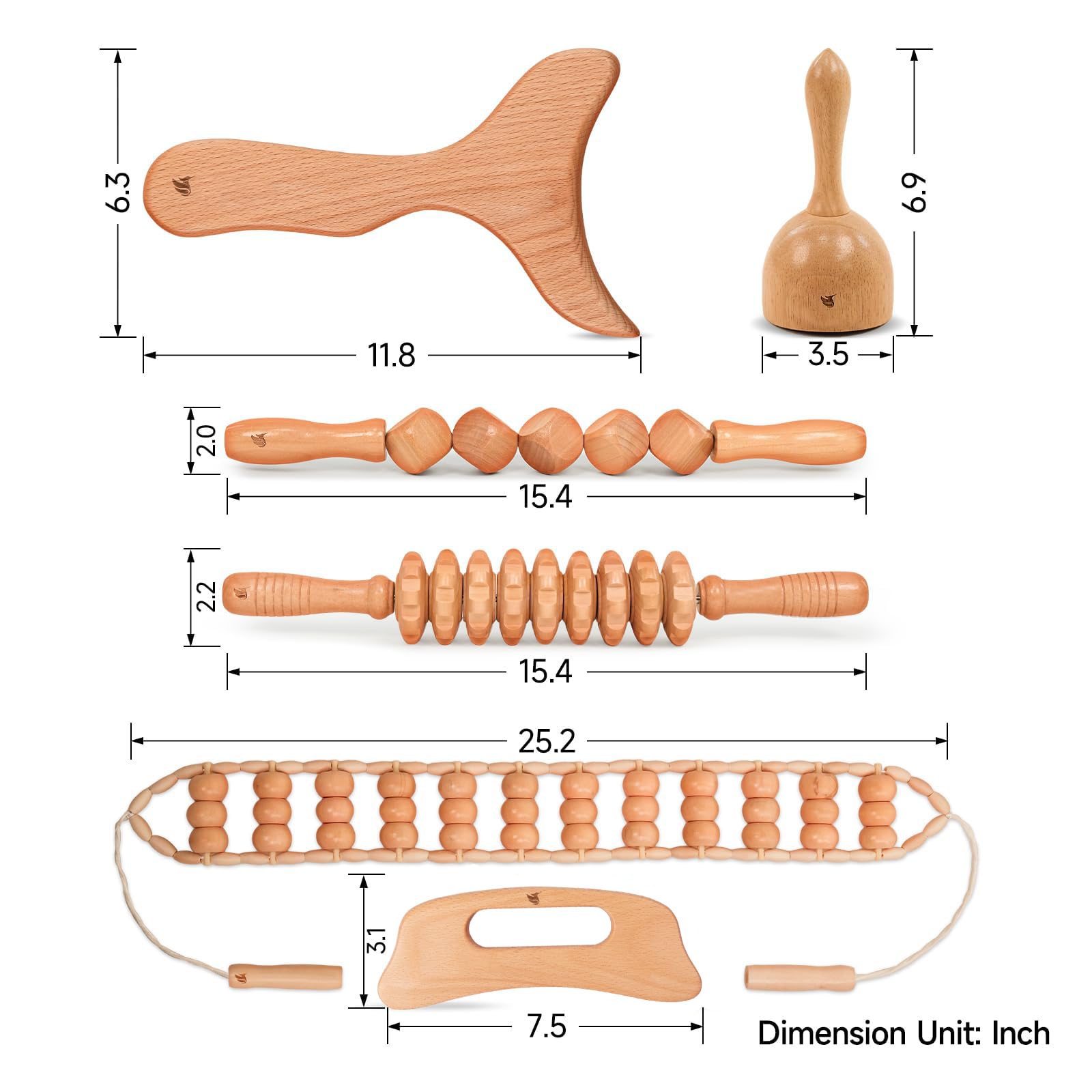 - 6 IN 1 WOODEN THERAPEUTIC MASSAGE TOOLS SET: Includes wooden roller bar, wooden massage cup, wooden moon scraper, wooden cube muscle massage roller bar, wooden scraper board and wooden back massage roller rope with professional manual, drawstring bag and gift box.