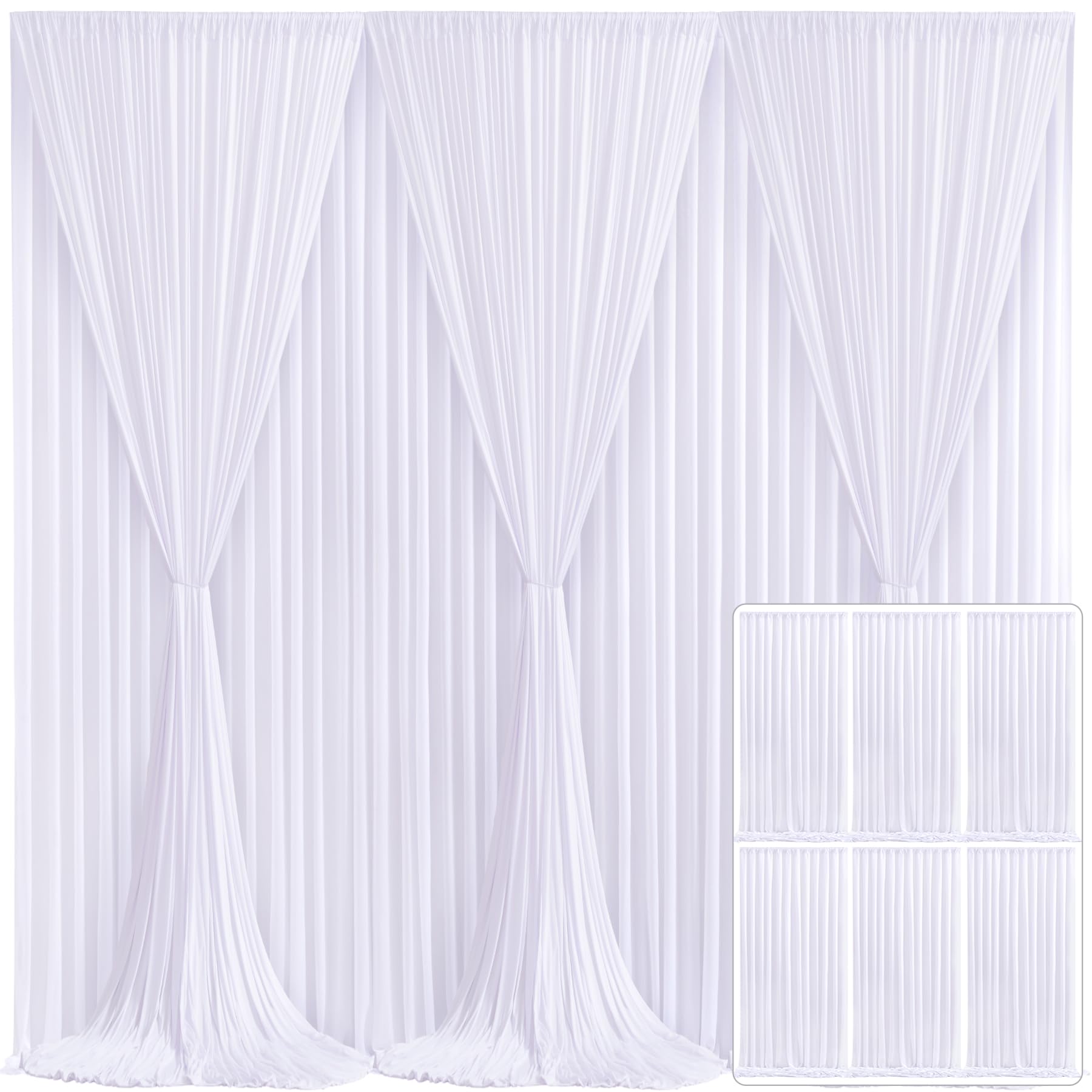 - ❤6 Panels White Backdrop Curtains Package: 6 soft fabric backdrop curtains per package. Each White Backdrop Drapes measures 59" wide x 120" height(5ft x 10ft). they were not in one width so you can decide how narrow or wide you want the backdrop by tightening or stretching