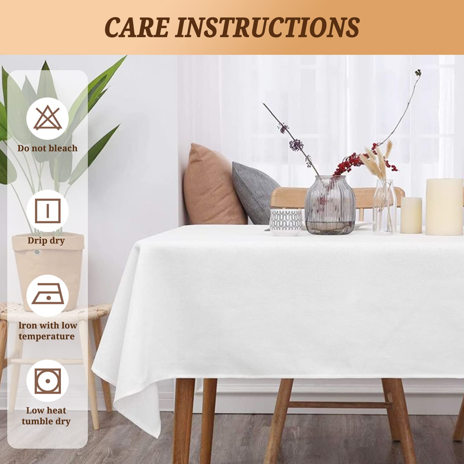 - Reusable Tablecloth: Premium Polyester table cloth Rectangle Tablecloths Easy to care, Machine wash in cold water, no worry of shrinkage, dry quickly.
