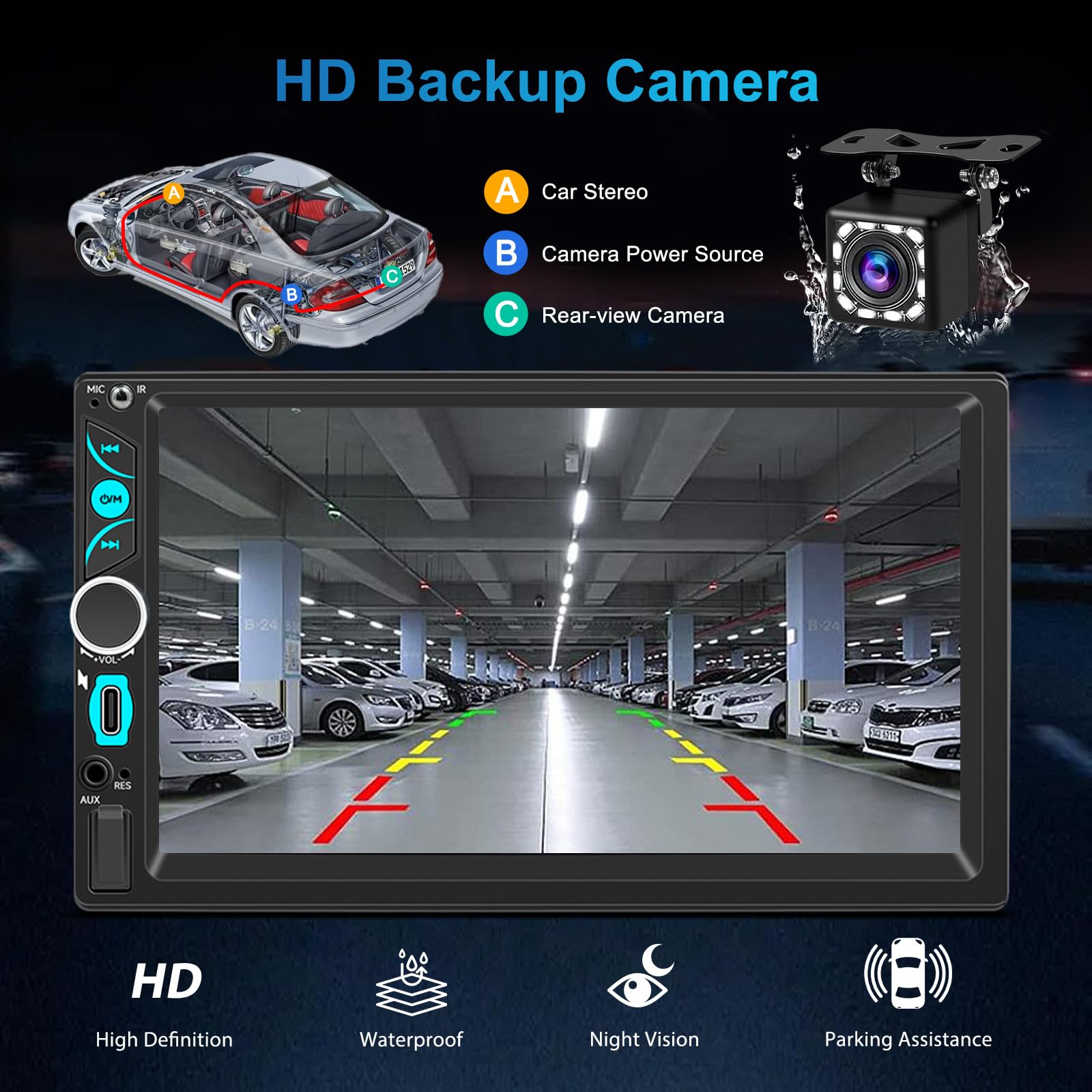- 【Car Radio with Reversing Camera】Double din car radio equipped with HD camera, ultra-wide viewing angle, waterproof design, HD night vision image, brings a safer and more time-saving experience! Let you park more easily, ensure real-time assistance and enhance safety during operation.