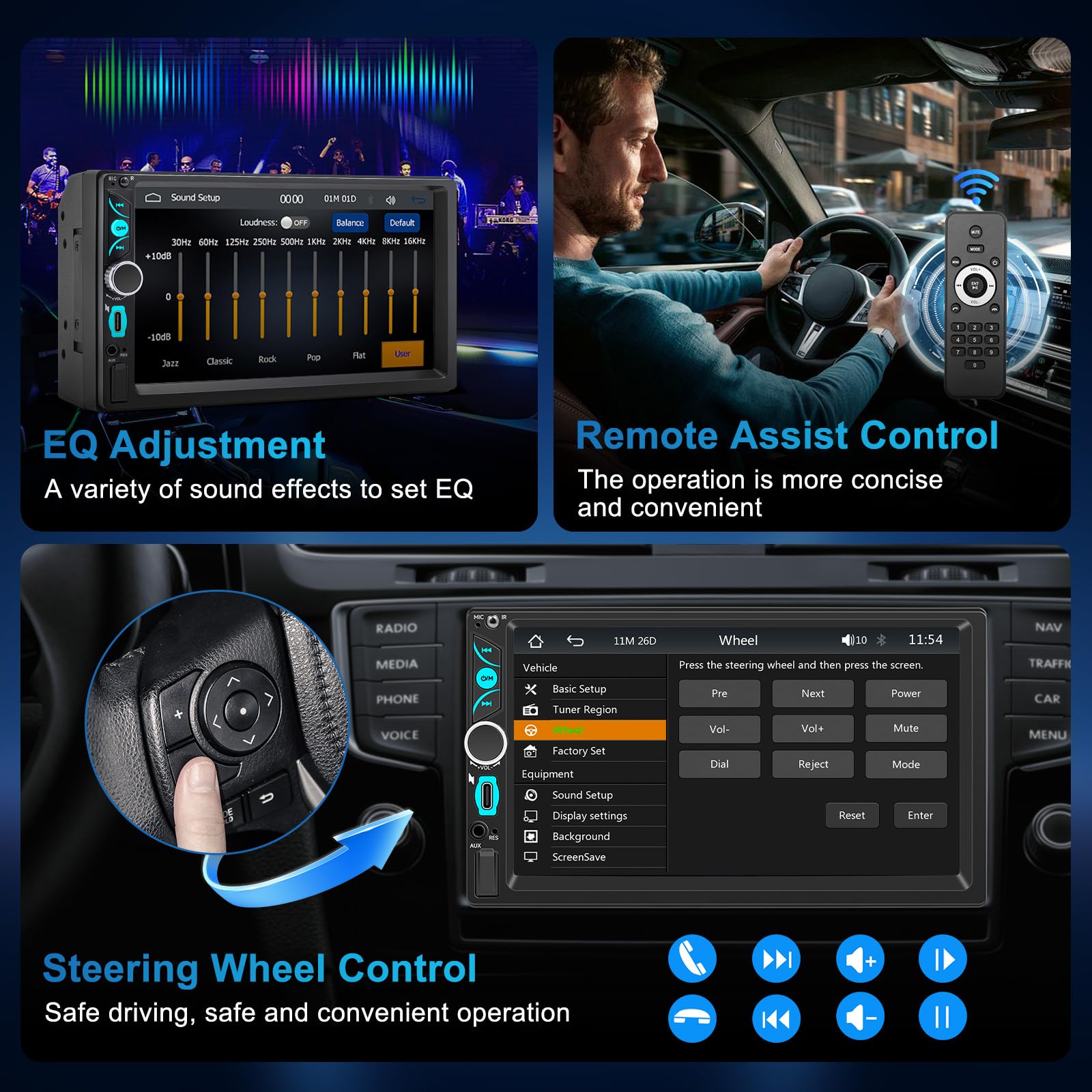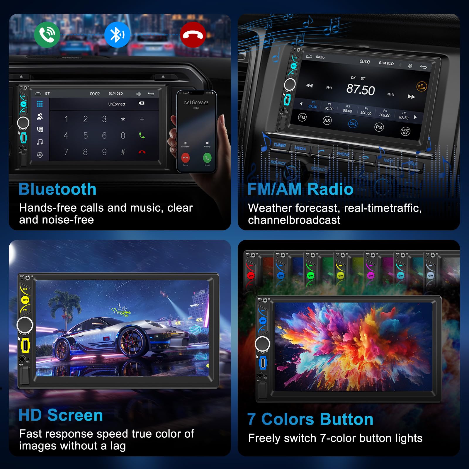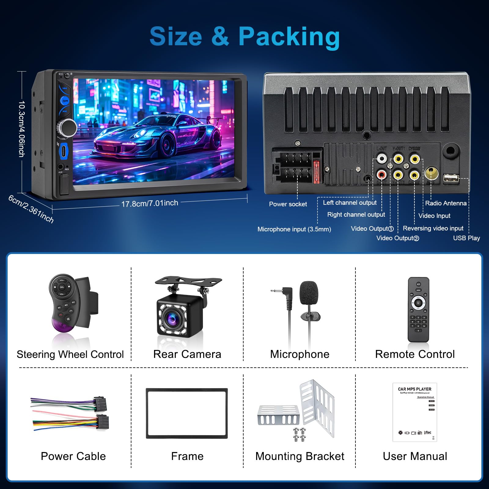 - 【High-Quality Car Stereo Player】This double din car stereo measures 7.01"(L)*4.0"(W)2.36"(H). Before ordering, please confirm it matches your car radio. It is equipped with a 7 inch 1024×600 full HD carplay screen, bringing clear visual effects and smooth operation experience.