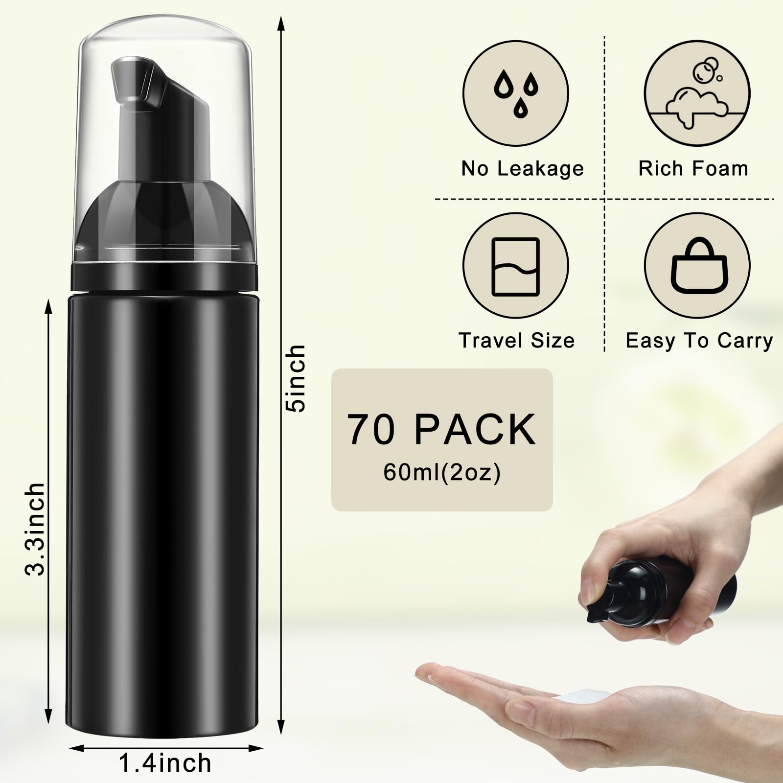 70 Pcs 2 oz Plastic Foam Soap Dispensers Refillable Soap Bottles with Pump Mini Cleaning Foam Pump Bottle Empty Foam Dispenser for Refillable Travel Hand Soap Shampoo Cosmetics (Black)