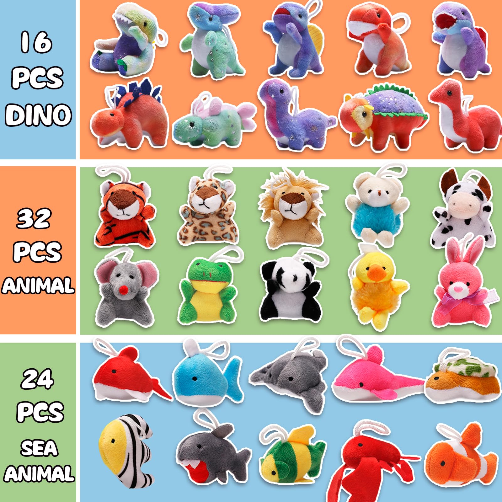 - 72 pack all different kinds of mini plush toys(16 Pcs Dino, 32 Pcs jungle animals, 24 Pcs Sea animal). The cute design is very charming with variety of colors. the most important thing is that each small stuffed animal is different from the other.
