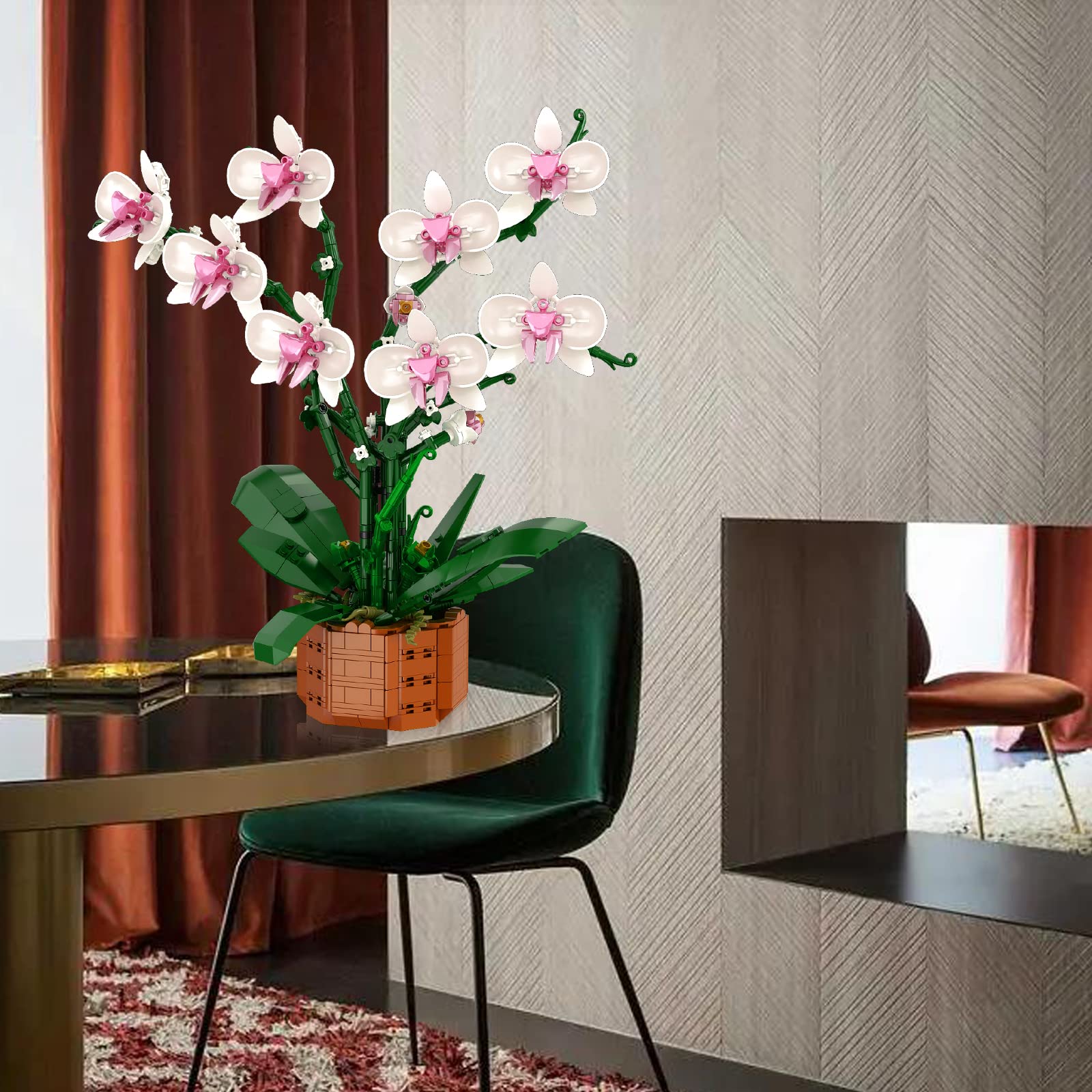 - Orchid Building Blocks Set - The size of this orchid building is 37.99*26*36cm consists of 729 pcs building bricks, This floral building toy is a handy project for the heart and soul. The artificial bouquet building brick set symbolizes the eternal relationship between people and creates a more romantic atmosphere.