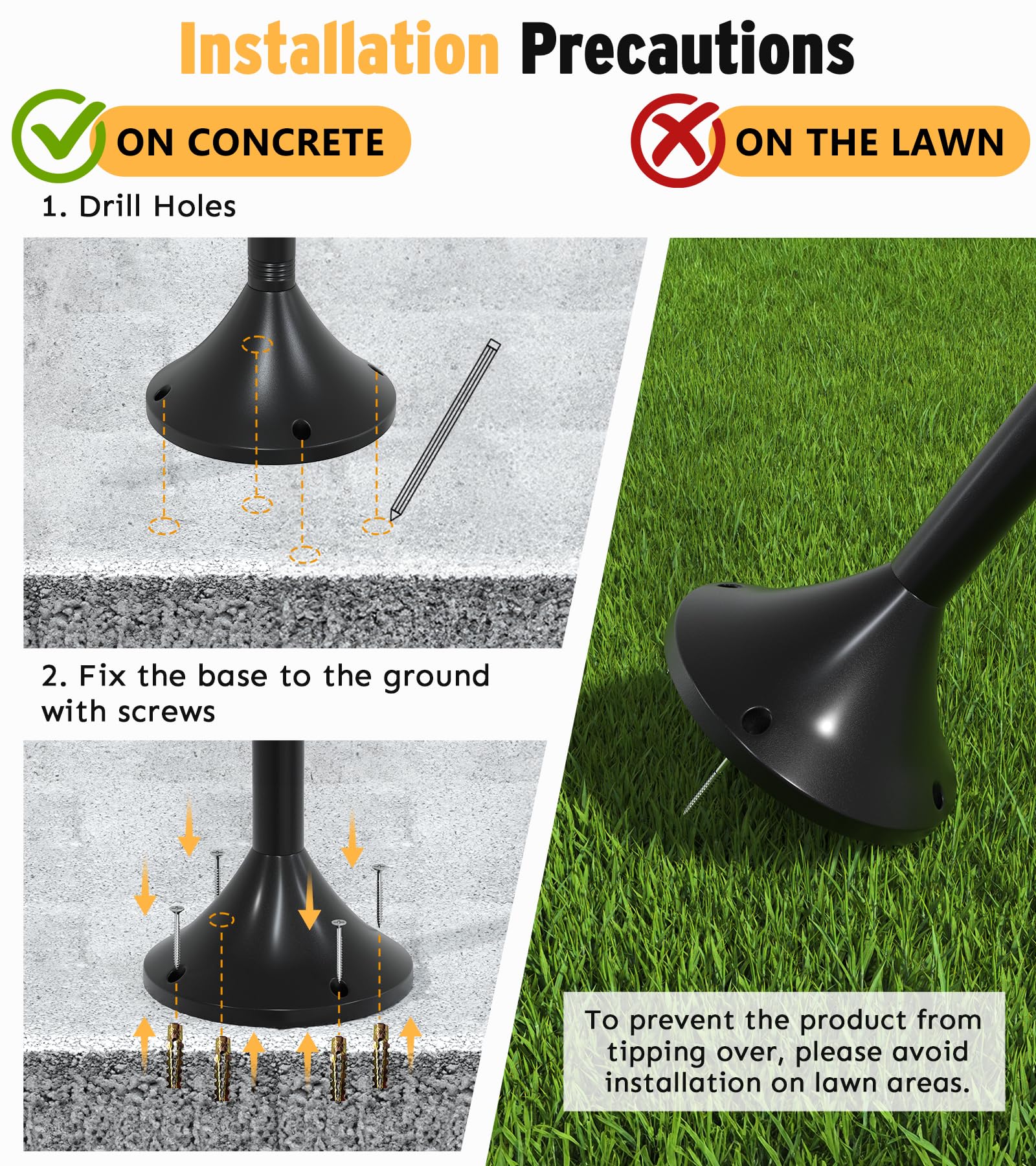 - 【Easy Installation】This solar pole lights outdoor is completely wire-free, making installation a breeze. For concrete floors, simply secure the base using the included screws. Adjust the height by removing or reattaching the connecting rods. (Please note: due to its weight, it cannot be installed on lawns, as it may tip over)