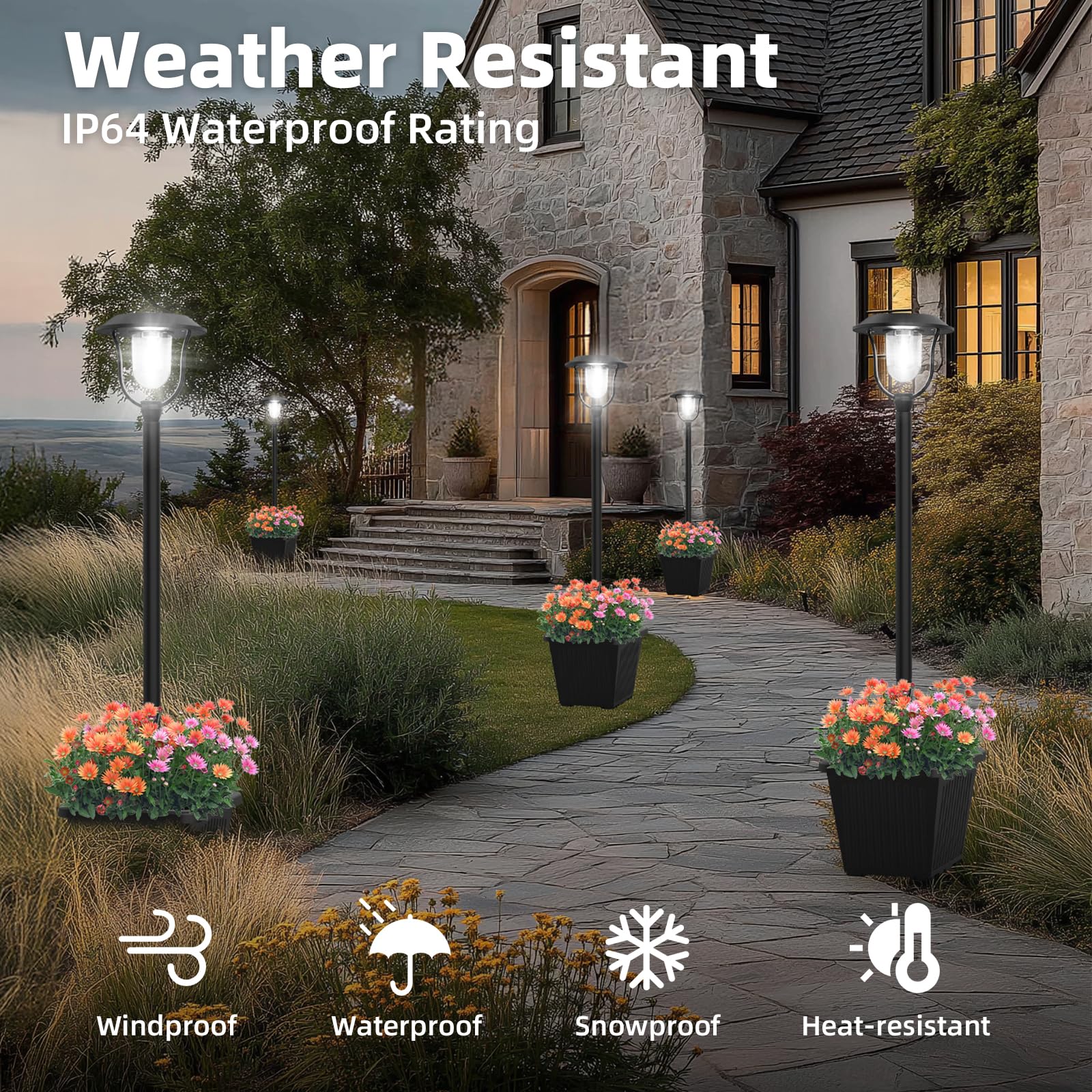 - Weather Resistance: Crafted from robust aluminum with a sleek black finish and a PS lens, this solar lamp post with planter has an IP64 waterproof rating. It can endure various weather conditions, ensuring long-lasting performance during sunny, rainy, or snowy days.