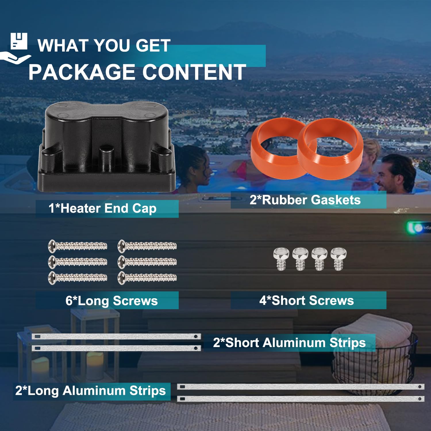 - 【Package Content】1*Heater End Cap, 2*Rubber Gaskets, 2*Long Aluminum Strips, 2*Short Aluminum Strips, 6*Long Screws, 4*Short Screws.