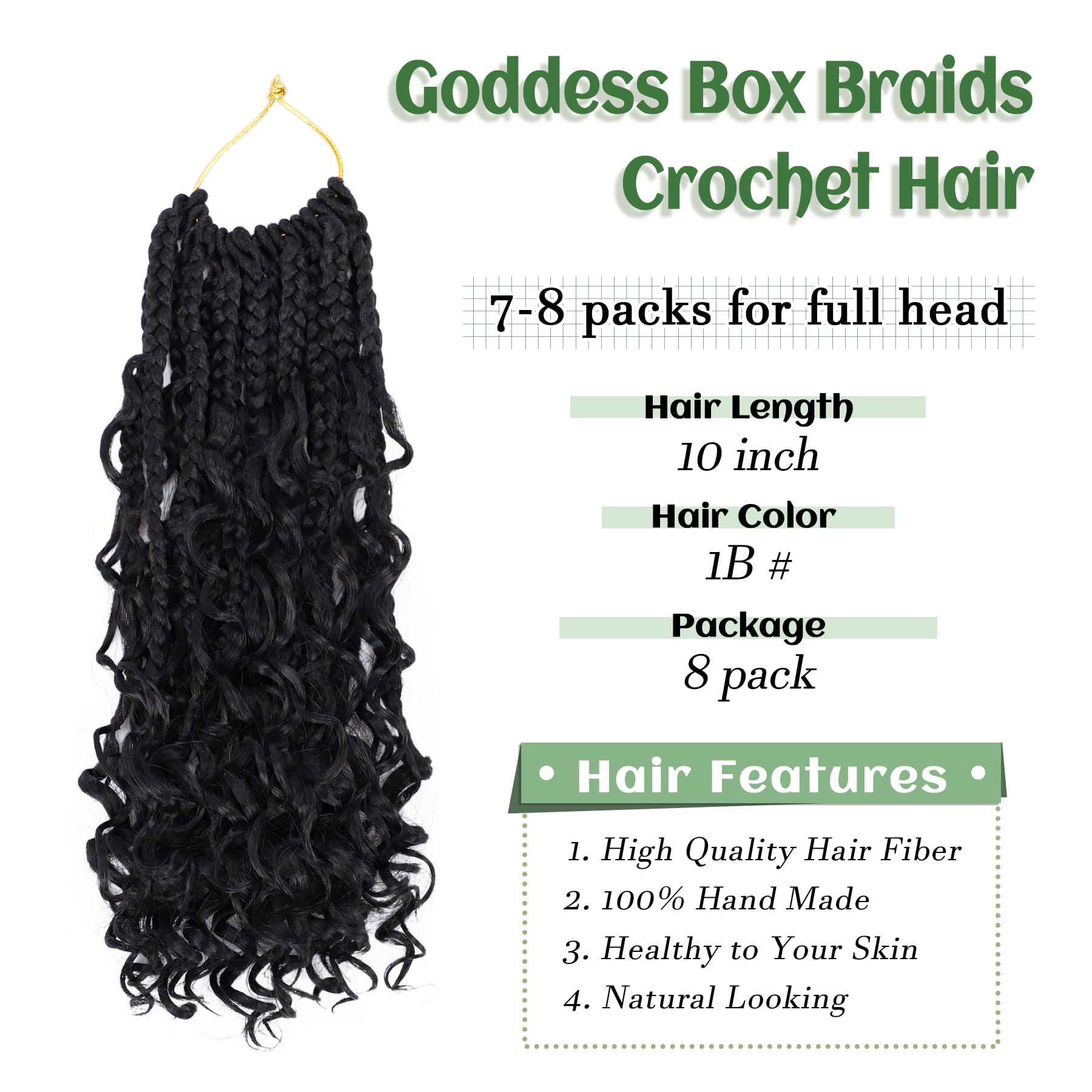 8 Packs Goddess Box Braids Crochet Hair 10 Inch Pre-looped Bohemian Crochet Boho Box Braids With Curly Ends 3X Crochet Braids Hair for Women Synthetic Braiding Hair (#1B)