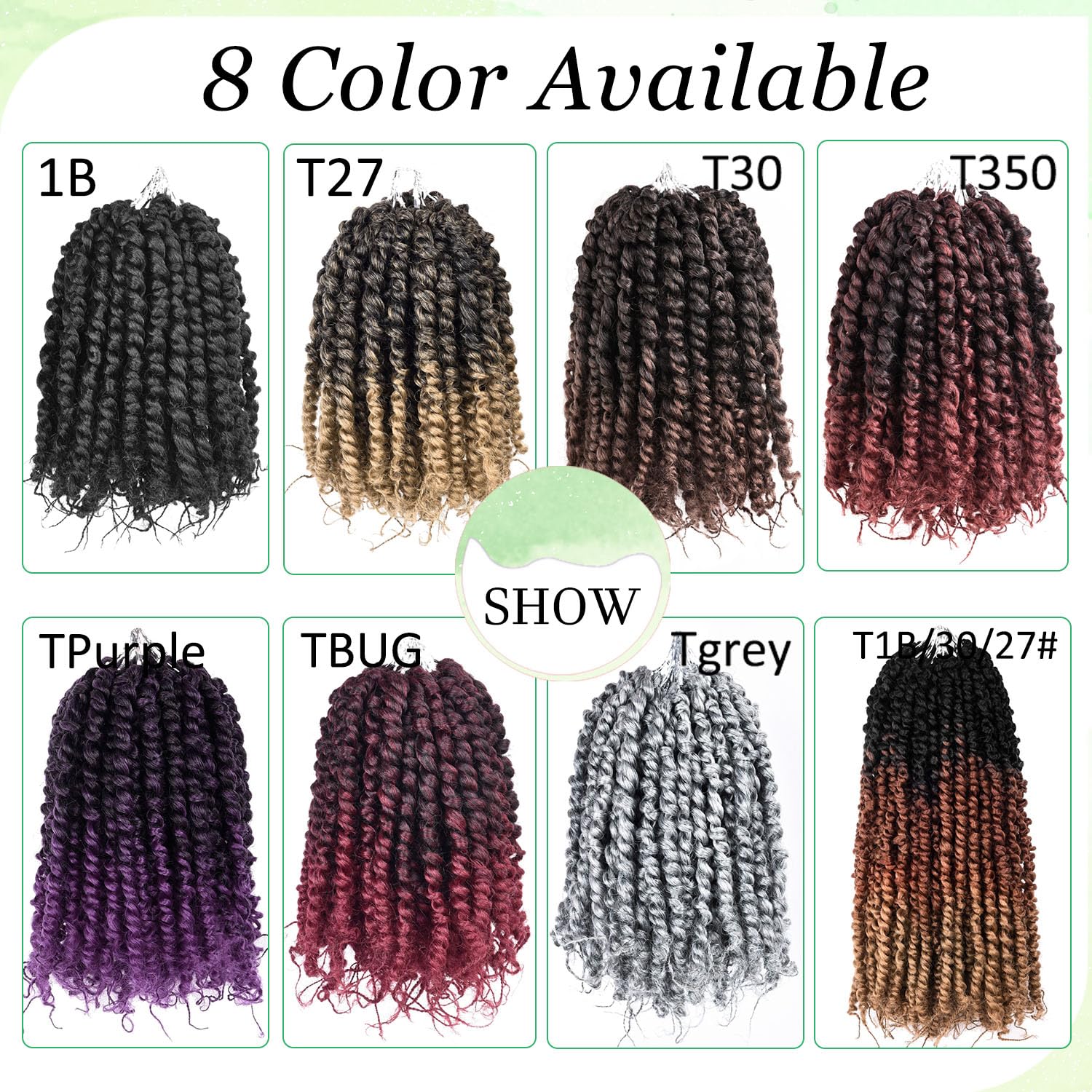 - 【Hair Specification】Crochet Pretwisted Passion Twist Hair is 8 Inch short Bob Length; 8packs/Package; Weight: about 30g/pack; 12Strands/pack; 96 strands In Total; Usually 8 Packs Can Full a Head; 1B#, T27#, T30, TBUG#, T350#, M/Grey# Colors Available; Comes with a crochet hair hook and rings.