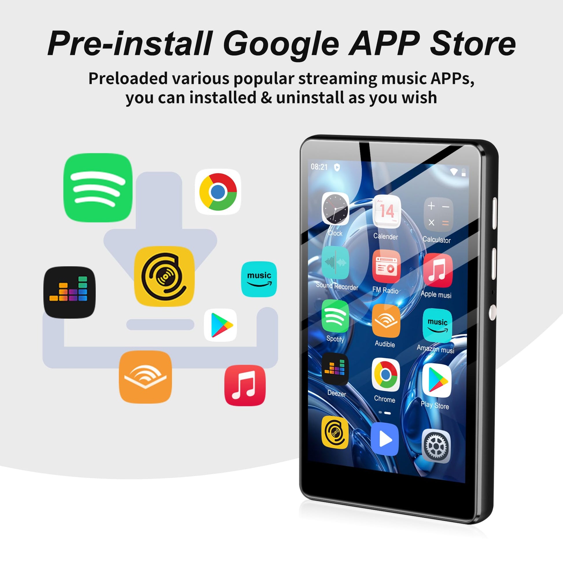 - 【Immersive Music Experience】Built-in support for popular services such as Apple Music, Spotify, Audible, Amazon Music, Deezer, etc., allowing you to immerse yourself in the world of music. Enjoy crystal-clear audio with lossless speakers, multiple playback modes, real-time lyrics synchronization, and the ability to listen to your favorite radio stations. Compatible with multiple music file formats, including MP3, OGG, FLAC, AAC, WAV, WMA, APE.