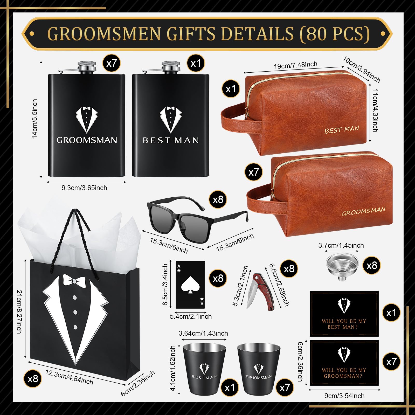 - Comprehensive Groomsmen Gift Set: 80Pcs Groomsmen Gifts Set of 8 includes 8pcs 8 oz Stainless Steel Tuxedo Flasks, 8pcs Elegant Stainless Steel Shot Glasses, 8pcs Funnel, 8pcs Mini Wood Folding Tool for Crafting, 8pcs Poker Card Bottle Openers, 8pcs Sunglasses, 8pcs PU Leather Toiletry Bags, 8pcs Gift Bags, 8pcs White Tissue Paper, and 8pcs Thoughtful Cards, Making it an ideal gift choice for your groomsmen on your special day.