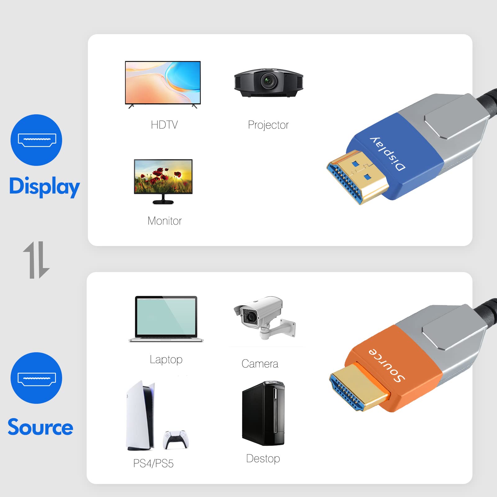 - [Enhanced Chipset] Boasting reduced power consumption, this innovative chipset eliminates the need for supplementary power sources and driver installations, facilitating a straightforward plug-and-play experience. [Caution!] Fiber optic HDMI cables operate unidirectionally. To guarantee a seamless connection, meticulously distinguish between the source and display plugs and confirm their correct insertion into the respective devices.