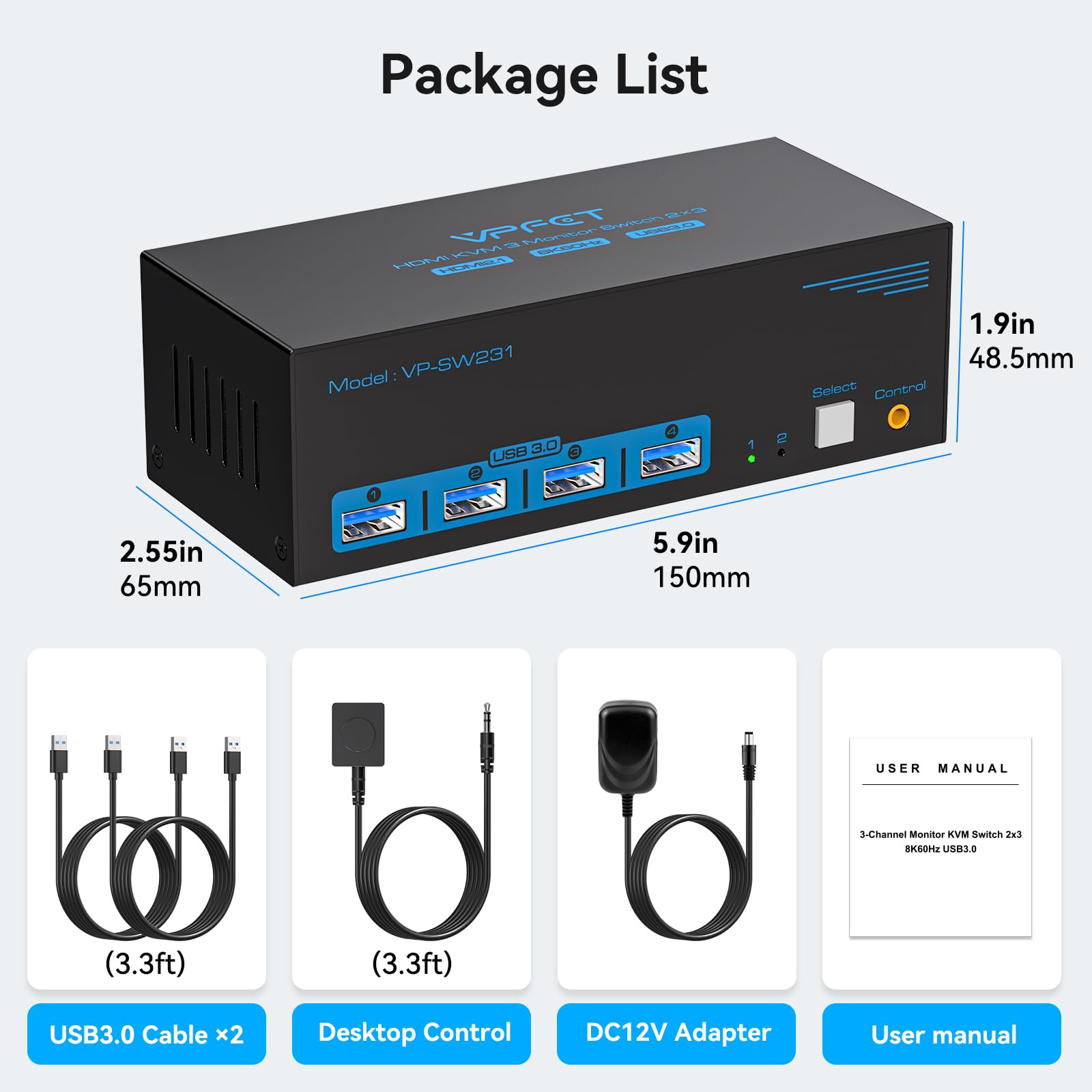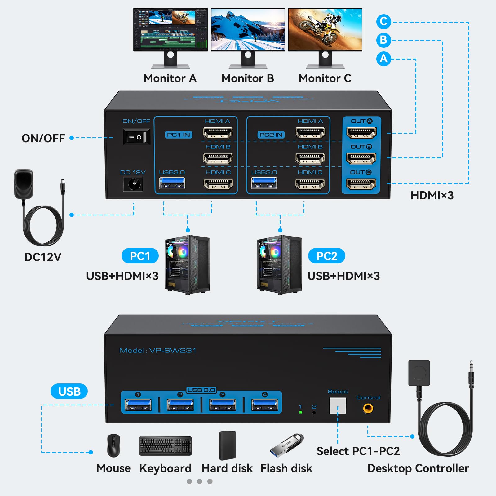 8K@60Hz HDMI KVM Switch 3 Monitors 2 Computers 4K@120Hz USB 3.0 KVM Switches for 2 PC Share Triple Monitor and 4 USB Ports Supports Extended&Duplicate Mode.Wired Controller DC 12V/1A Adapter Included