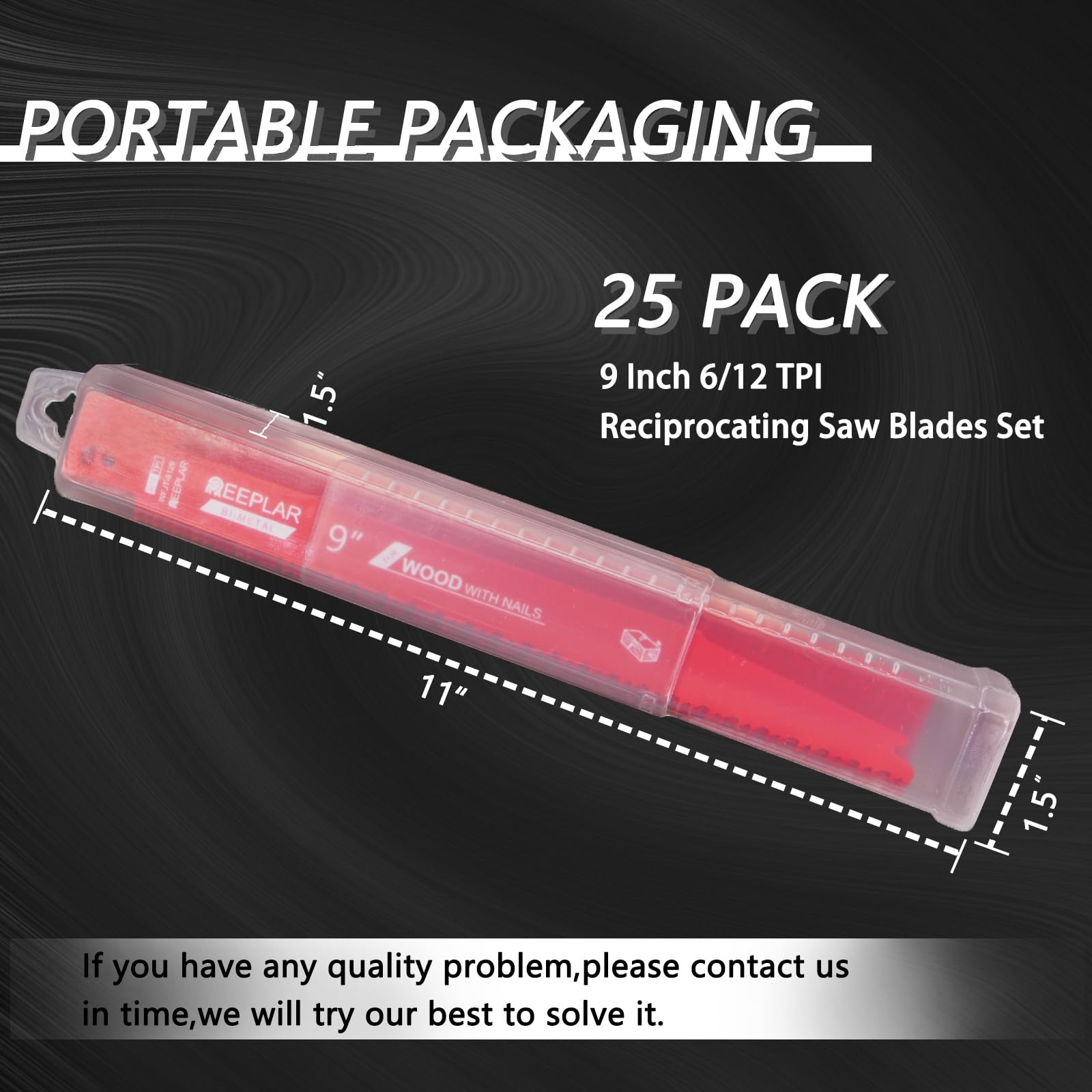 - Packing includes: Includes 25 pcs pack 9in 6/12 TPI reciprocating saw blades, neatly stacked in a transparent non-disposable box, we can always remove one of the pieces and reclose the box when using it, which is very convenient to carry when going out to pruning wood.