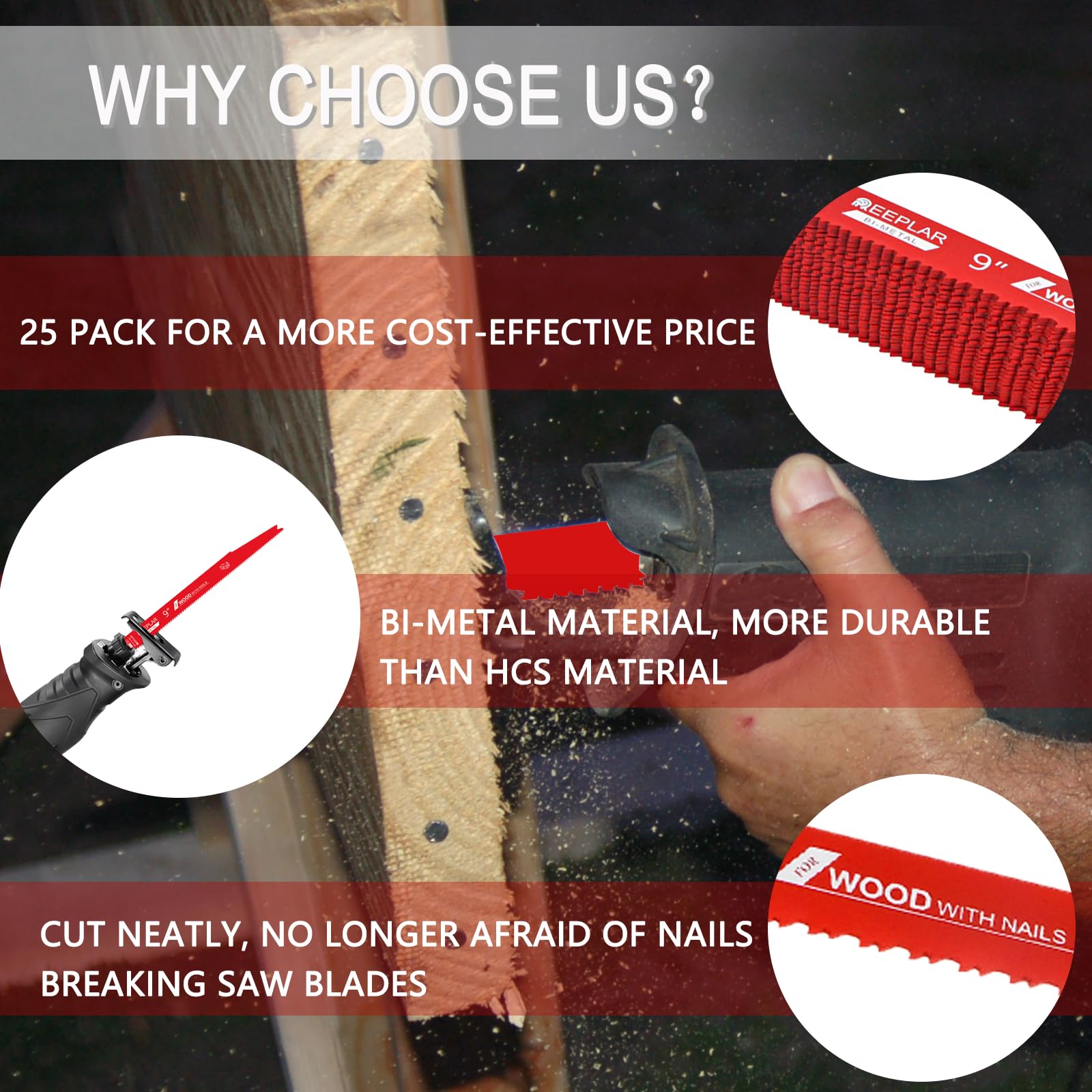 9 Inch 6/12 TPI Reciprocating Saw Blades Set Bi-Metal Pruning Blades for Nail-Embedded Wood,25 Pack,Wood with Nails,Metal/Wood Cutting Sawzall Blades