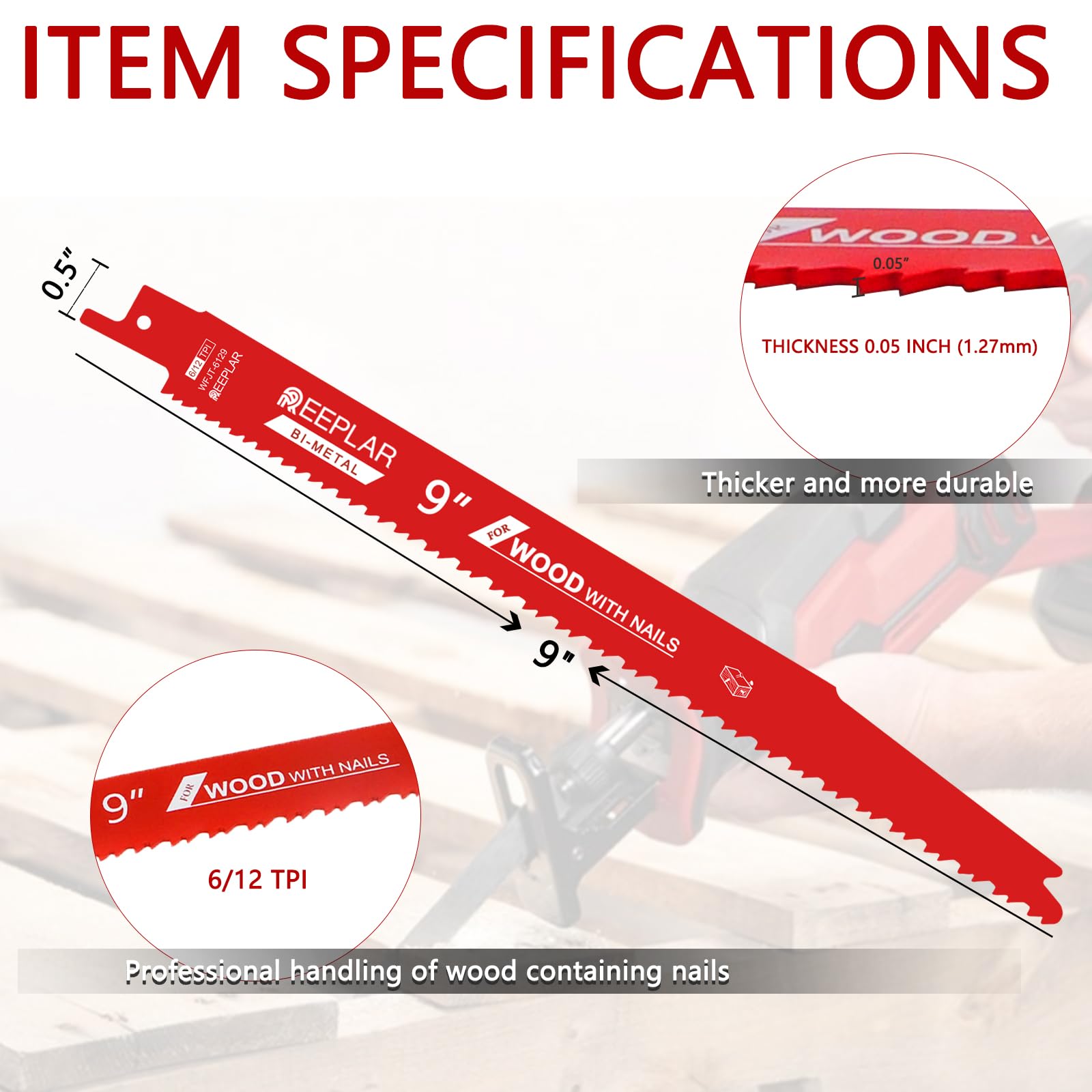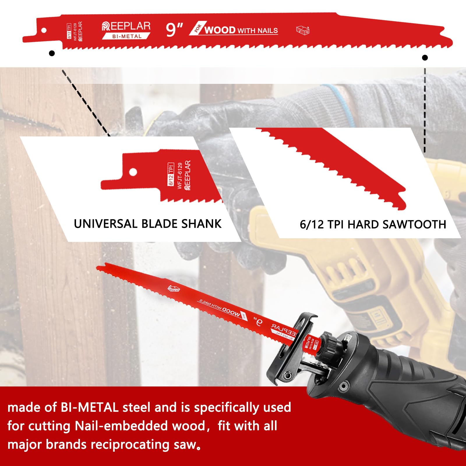 - Multifunctional:9 inch 6/12 TPI reciprocating saw blades provide superior cutting performance at both wood and nail-embedded wood, when we trim wood containing nails such as abandoned fences, no longer have to worry about nail damage to the saw blade or frequently replace different kinds of reciprocating saw blades, solving the reality we often encounter.