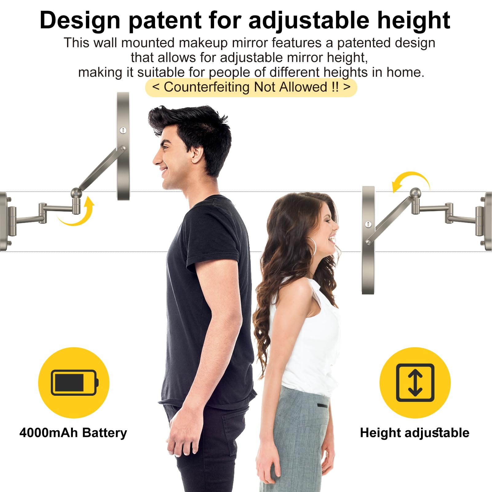 - Ajustable Brightness & 3 Colors Lighting: The light up mirror has 3 different lighting settings, including white light(7000K), natural light(5000K) and warm light(3000K) to help you get the ideal light for your makeup or read application. The stepless dimming feature allows you to adjust the brightness to your desired level, while the smart touch control makes it easy to switch between different lighting modes. This innovative lighted vanity mirror is the perfect addition to your beauty arsenal.This wall-mounted makeup mirror adopts a patented design with adjustable height. Counterfeiting will be prosecuted!