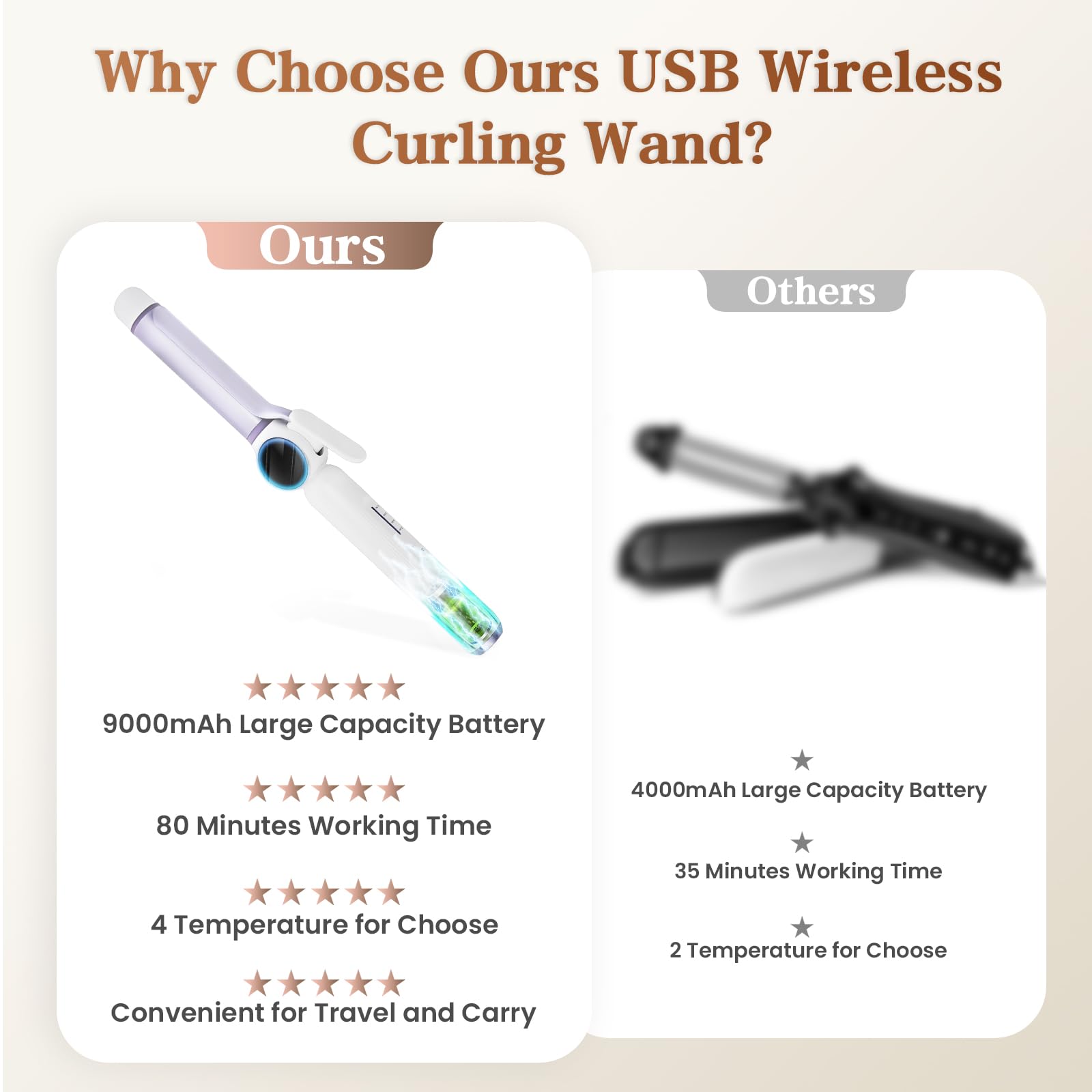 - Marathon 80-Minute Runtime:Powered by a massive 9000mAh rechargeable battery, this cordless curling iron delivers over 80 minutes of cord-free styling per charge. Versatile USB charging (wall adapter/car/power bank compatible) ensures ultimate convenience. Important: Always use unplugged and fully charge before first use. NOT SUITABLE for EXTREMELY THIN HAIR. It can be used with styling spray.