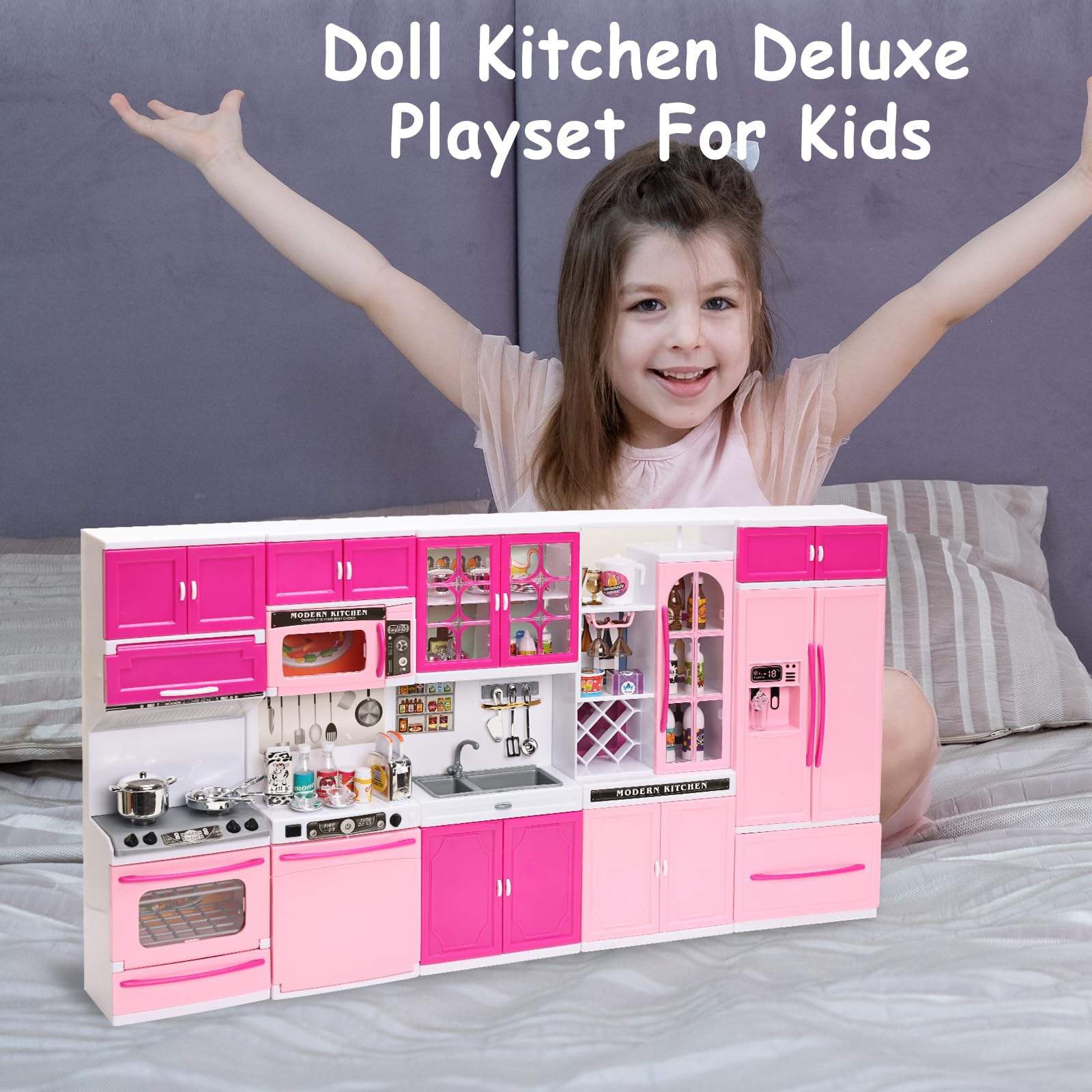 91 Pcs Doll Kitchen Playset for Kids, My Modern Mini 5-in-1 Kitchens House Furniture for 11.5 Inch Girl Dolls Pretend Play Kitchen Toy Accessories for Kids Doll Dreamhouse Set for Dolls