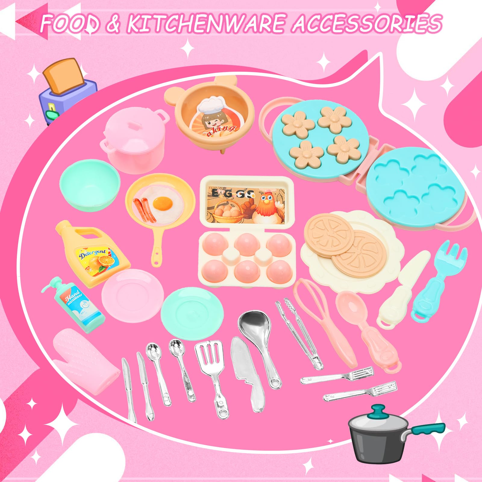 - 【Safe & Durable Material】 - Kids play kitchen toy is made of BPA-free, non-toxic ABS plastic and child-friendly material, cute shape with smooth and rounded edges. Each part measured 5x2.75x12.6inch. Safe for kids 3 years and up. Girls can play alone or with their doll friends with the pretend cooking playset.