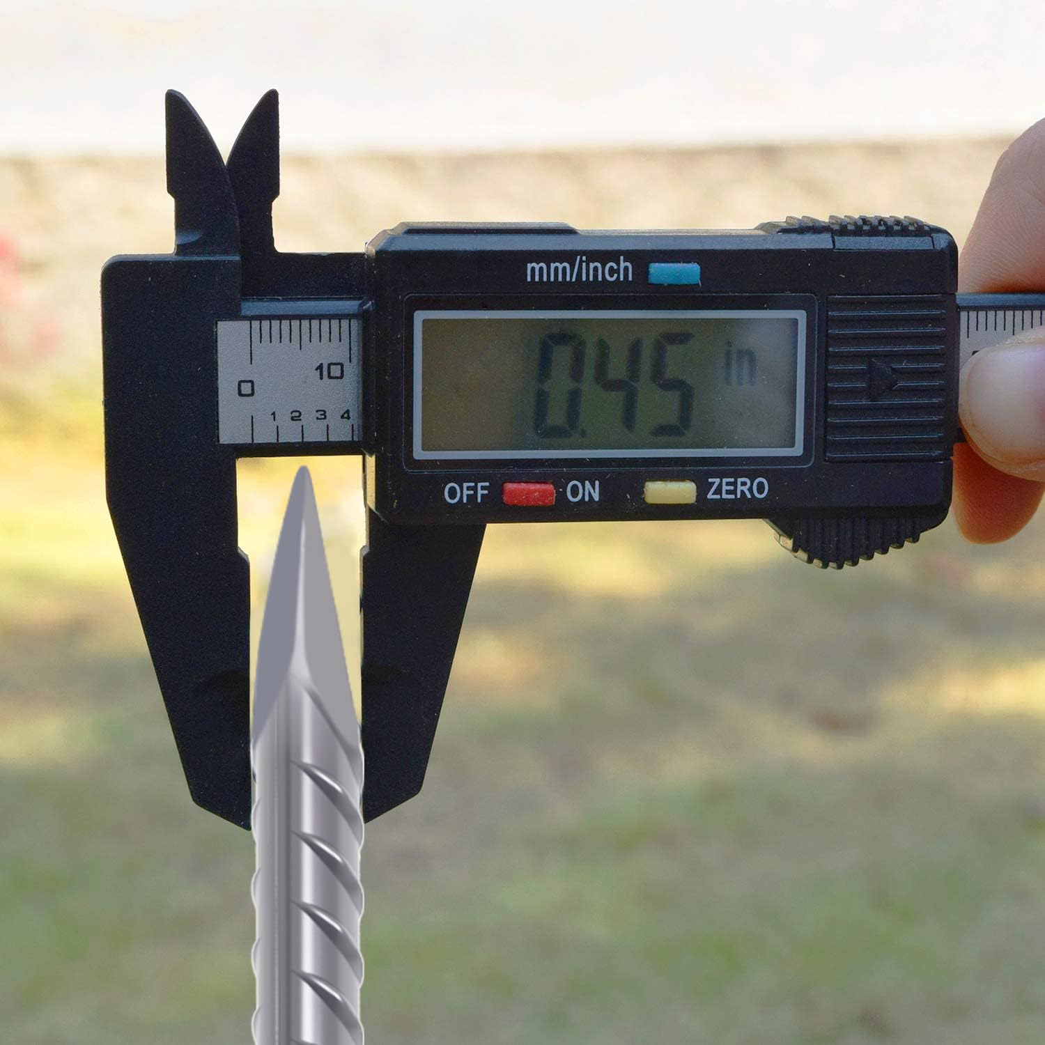 - TENT STAKE MEASUREMENT-12 inches long top to bottom, Hook inner Diameter is 1-1/2 inch, Steel Rod is 3/8 inch diameter thickness.