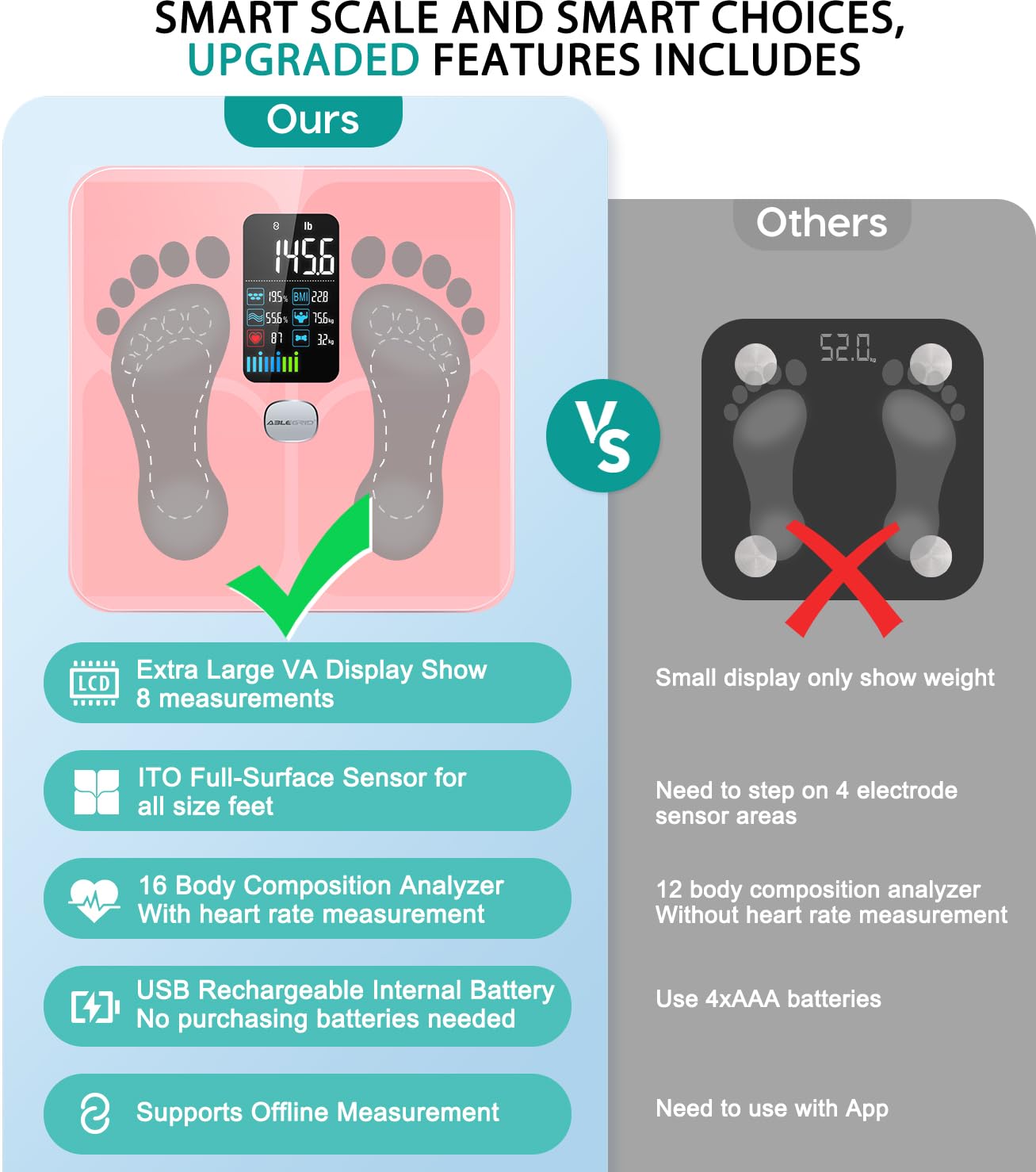 ABLEGRID Body Fat Scale,Digital Smart Bathroom Scale and Fat Percentage,Large LCD Display Screen,Rechargeable Body Composition Analyzer for BMI,Heart Rate,Baby Mode,400lb-Rosegold