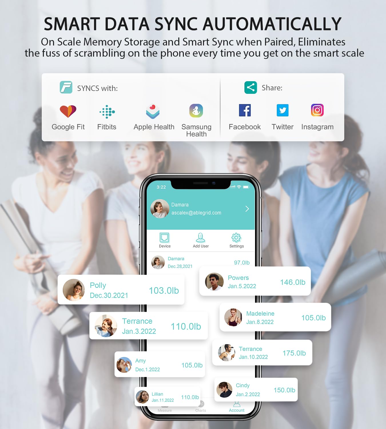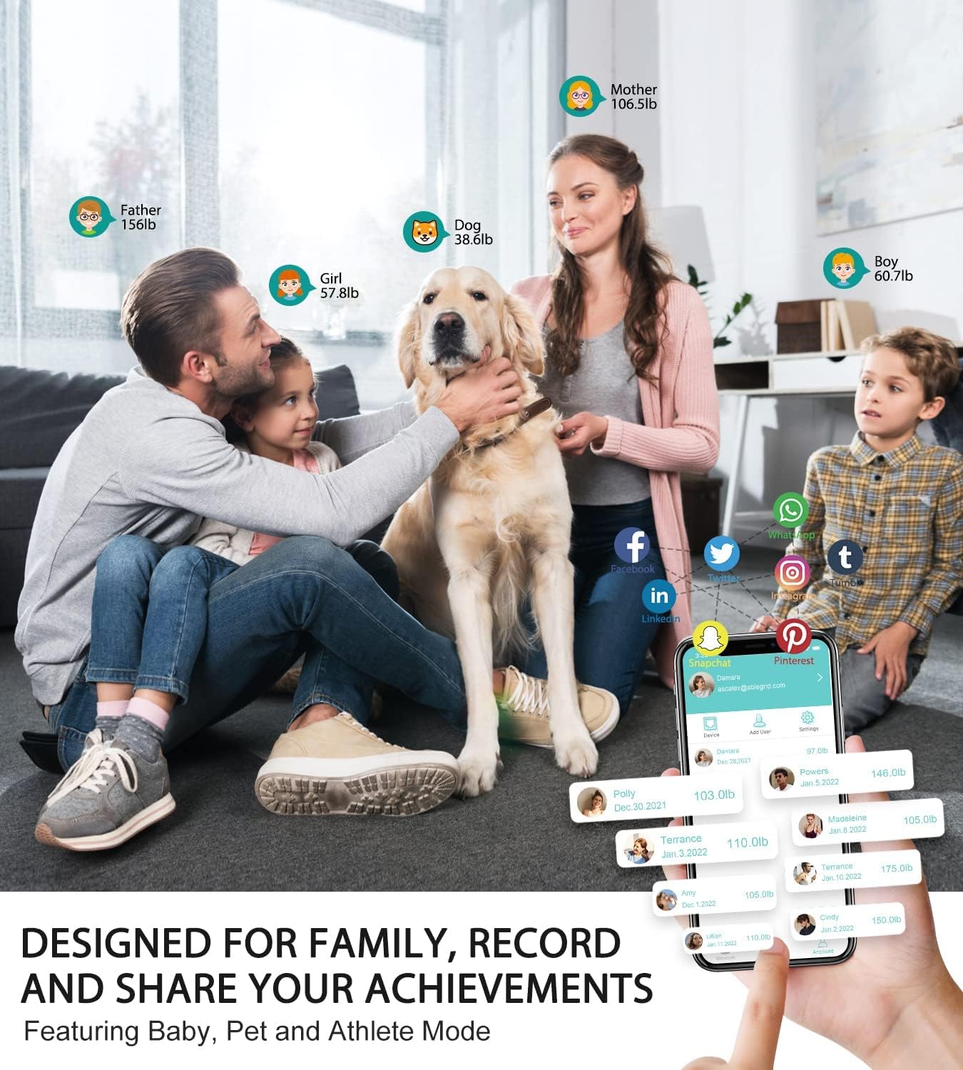 - 6.Multiple User Profiles:The "Fitdays" APP allows for unlimited user accounts,each holding up to 24 member profiles.It’s smart enough to automatically recognize who steps on,each user will receive the data on their own devices conveniently,which allows for seamless tracking of your family’s health.Use guest mode for a non-recorded check-in or baby mode to track your baby or pet's weight growth conveniently,the athlete mode provides more accurate measurements for professional athletes.