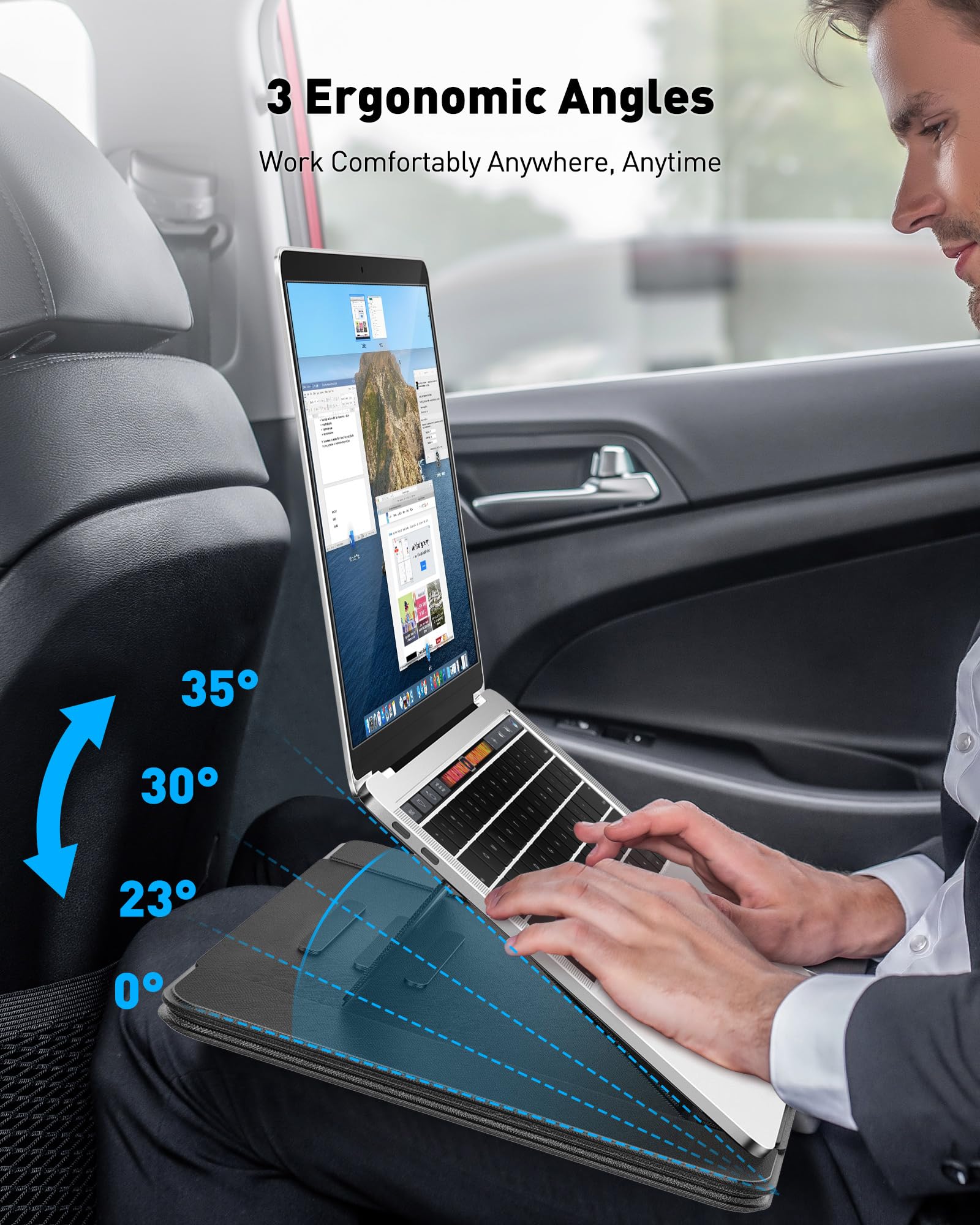 - Adjustable Lap Desk With 3 Ergonomic Angles - Our innovative laptop lap desk offers 23°, 30°, and 35° viewing angles for optimal comfort. This portable lap pad reduces neck and wrist strain, ensuring a comfortable experience during extended use on any surface.