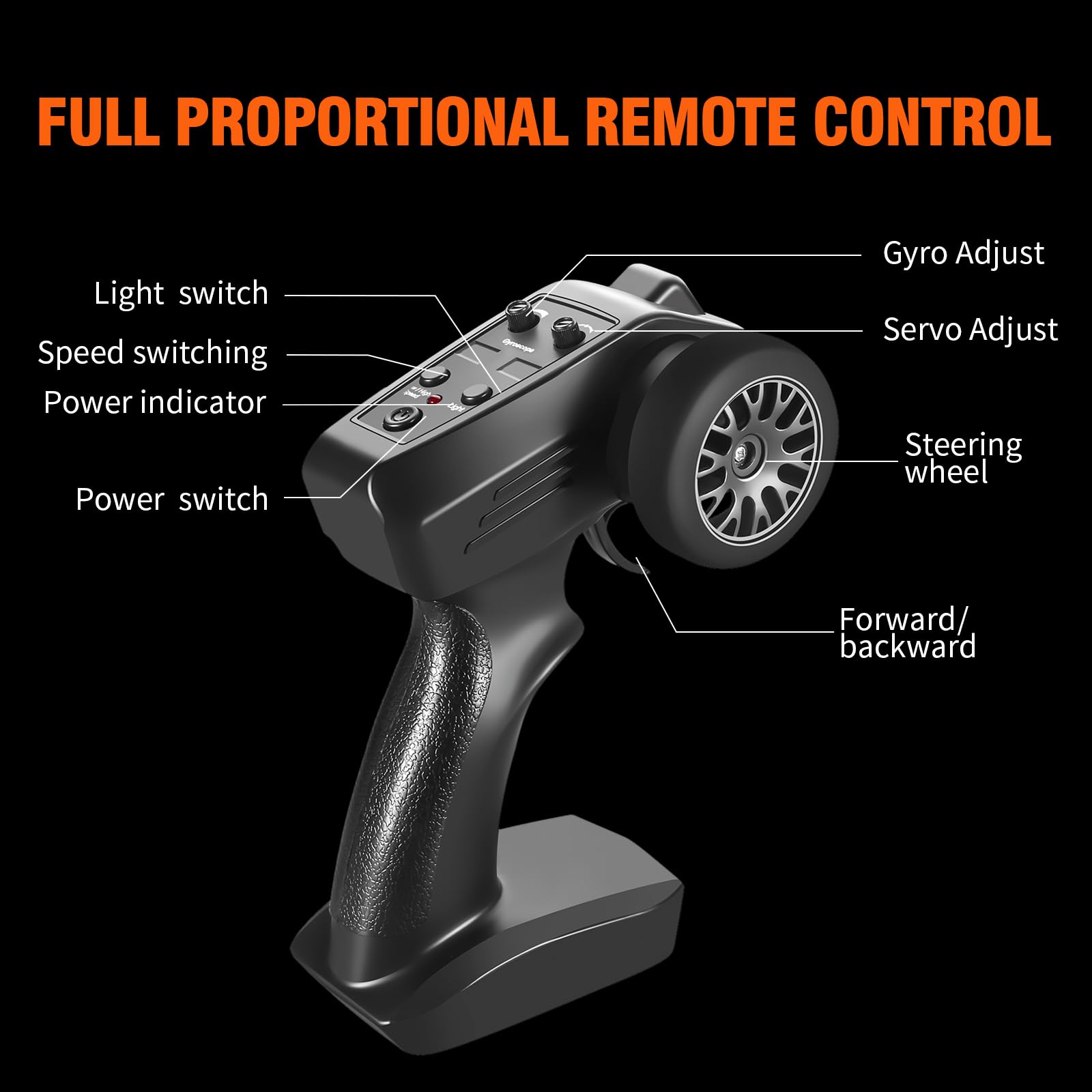- With Gyro to Drift: This drift car with gyroscope can automatically correct the tire offset angle during the turning process, which can make the drift smoother. In addition, you can adjust the gyroscope strength or choose to turn it off on the remote control for different players.