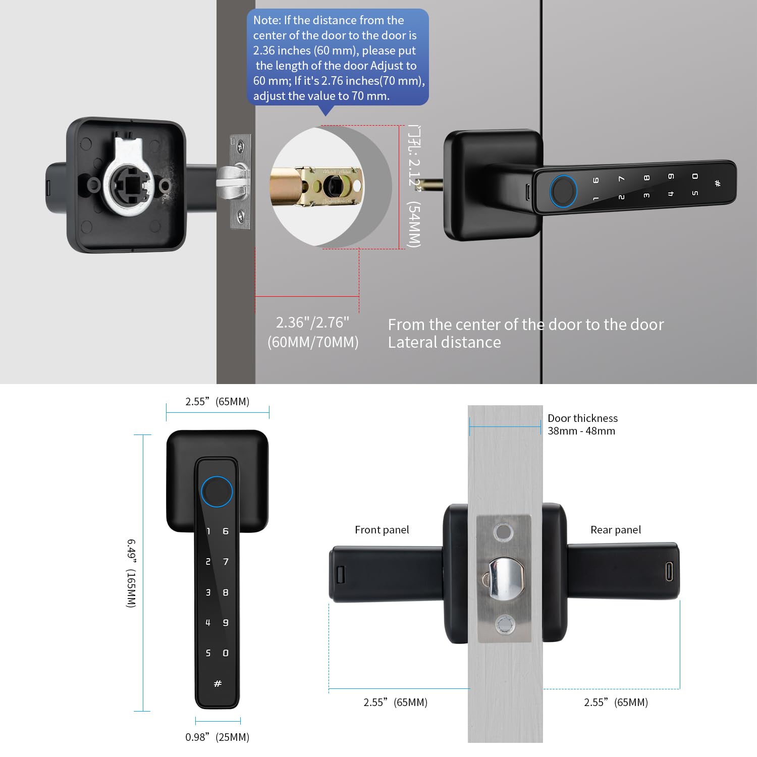- 【Easy to Install】 Digital lock meets the standard of most lever locks. No hard wiring required, just determine the direction of the lock. Door thickness: between1-3/8"(35mm) to 2-3/16"(55mm), adjustable latch 2-3/8"(60mm) or 2-3/4"(70mm). Please check your door size before purchase. The keyboard door handle needs 4 AAA batteries (Not included), it has a low battery alarm function and comes with a USB port for emergency charging.