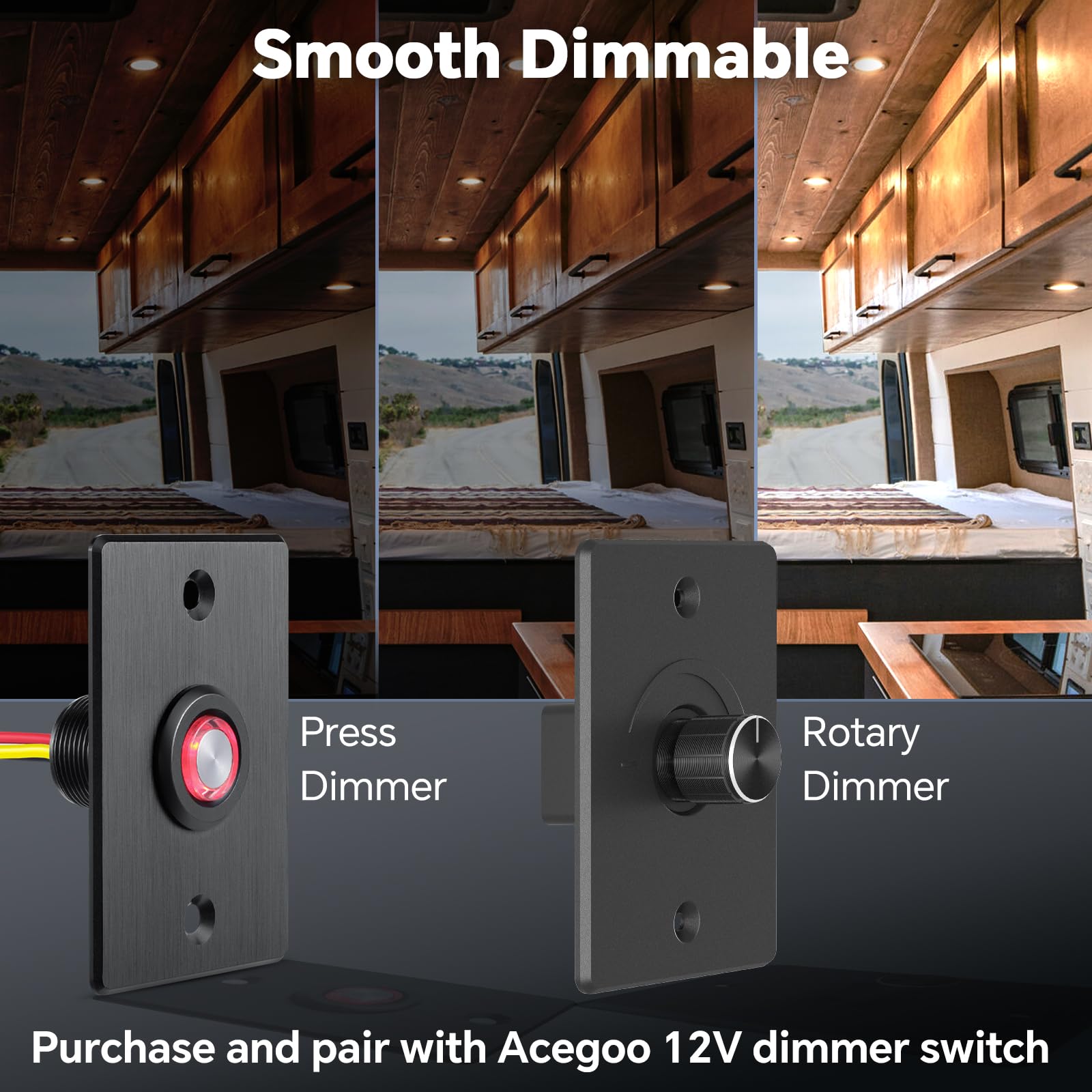 - Full Range Stepless Dimming: The LED 12V Light Fixtures are compatible with Acegoo's 12V dimmer, allowing for 0-100% smooth dimmable lighting and saving battery power. The dimmer switch (integrated with on/off and dimming control) is sold separately