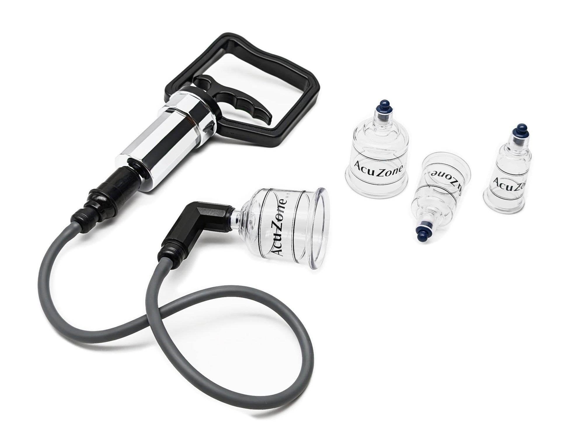- The set includes 19 plastic cupping cups (13 x 2" dia cups, 1 x 1.75" dia cups, 2 x 1.5" dia cups, 2 x 1.25" dia cups, and 1 x 1" dia cup), 1 x Hand Pump, and 1 x Extension Tube