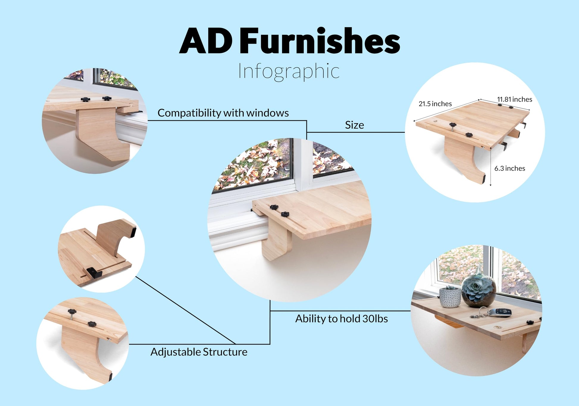 AD Furnishes Original SillMate Window Plant Shelf, 21.25" Sill Shelf for Plants - Verify Sizing First - Cat Perch - Renter Friendly No Drilling/Damage - Sill Extender for Plants - Window Table