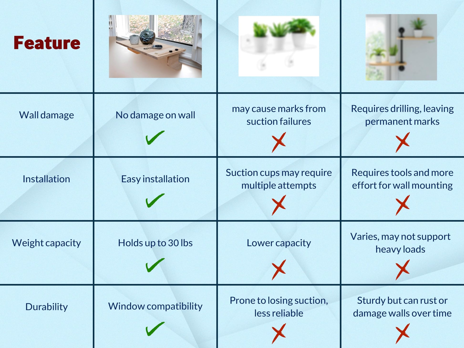 - Easy Installation: Renter-Friendly, No Drilling or Damage. Designed for a hassle-free setup, our window sill shelf securely clamps in place with no drilling, screws, or wall damage—perfect for renters and homeowners alike. Set up in seconds and enjoy a sturdy, reliable space for your plants, décor, or essentials without leaving marks behind.