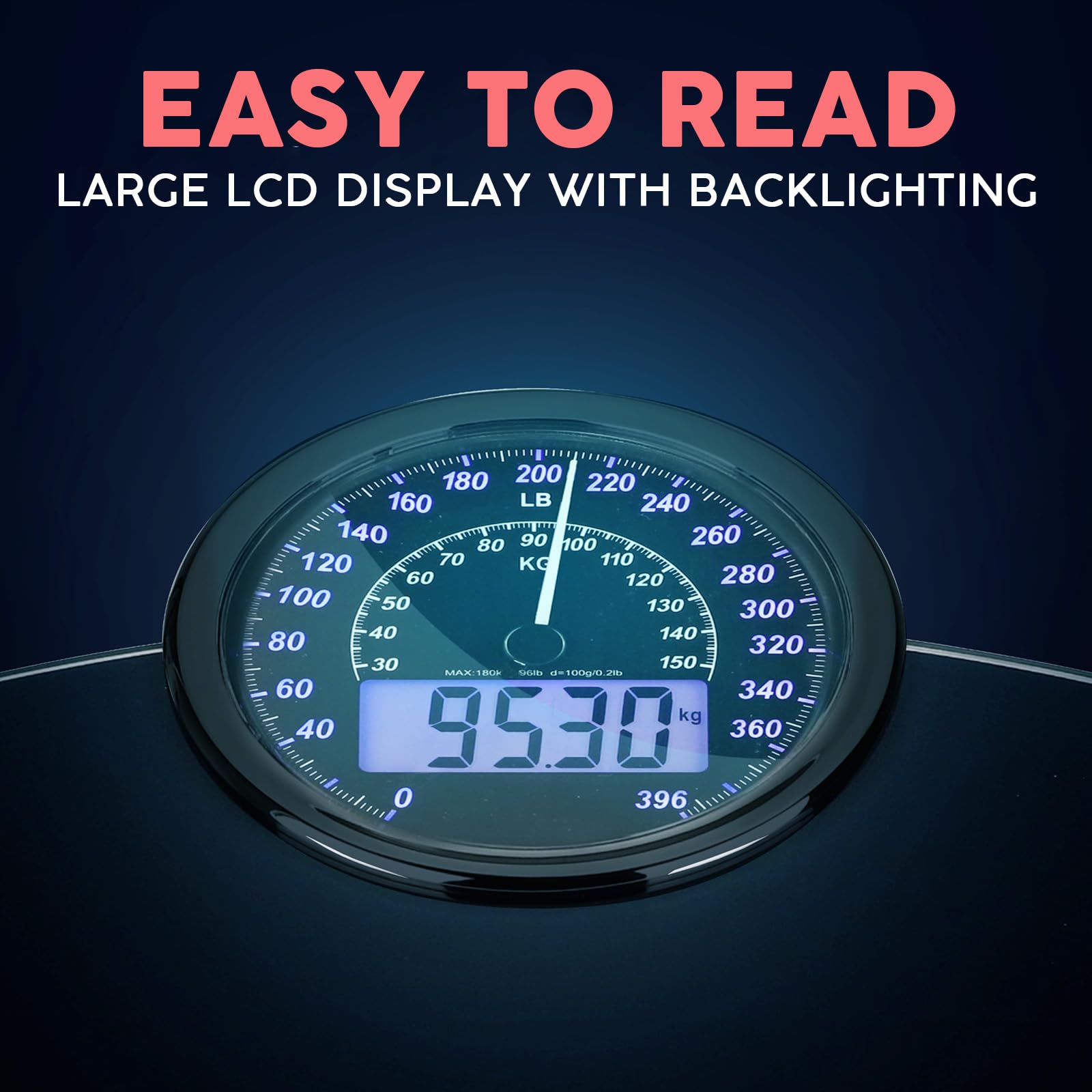 - 🌟 EXTRA WIDE SCALE WITH TEMPERED GLASS: Experience the luxury of an extra-wide platform crafted with premium tempered glass. Designed to accommodate users with larger feet, including those with shoe sizes up to UK Men's size 10.5, our scale offers both style and substance for your weighing needs.