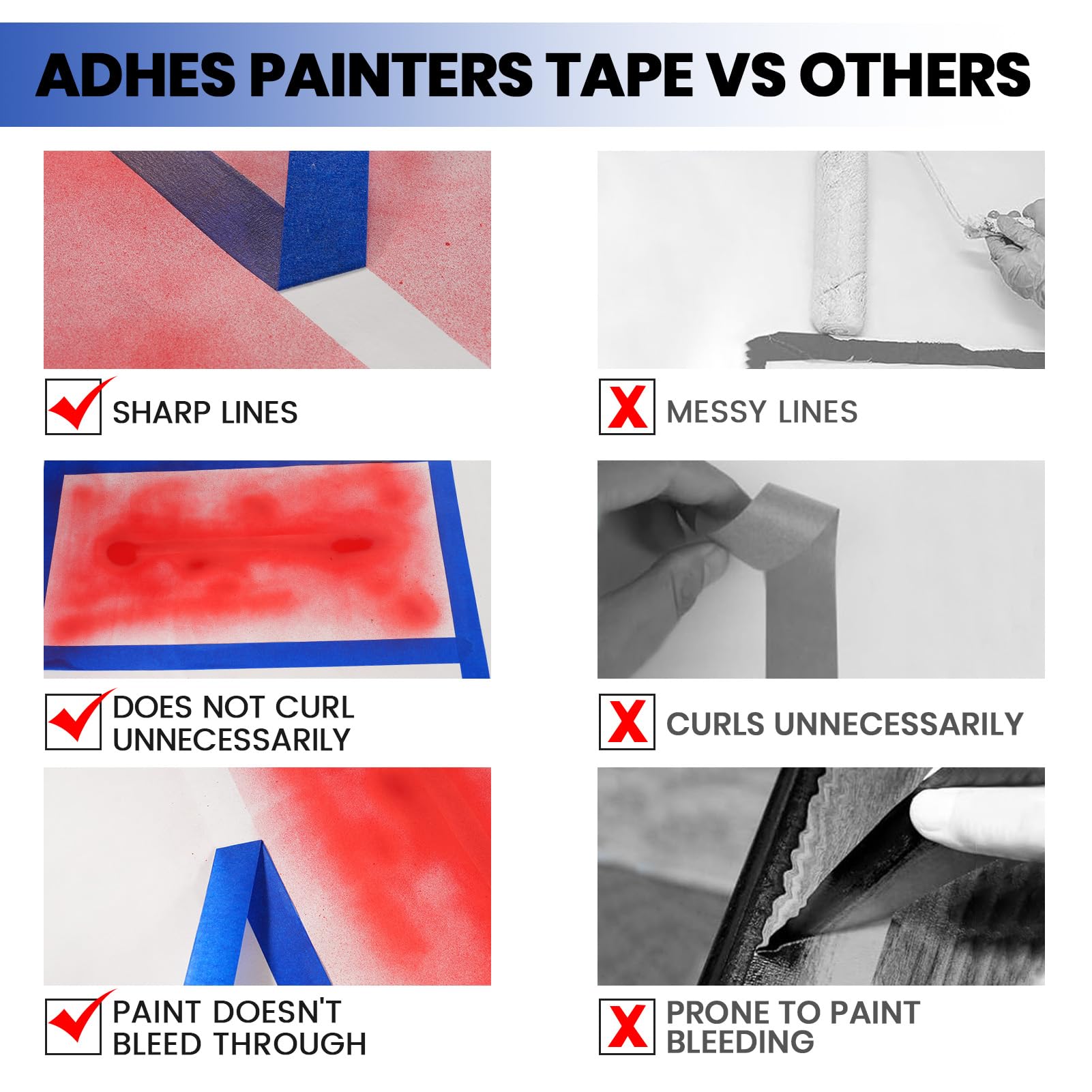 - 【Professional Grade Tape】Our blue masking tape, measuring 2 inches in width, ensures a flawless edge every time. It guarantees sharp lines, maintaining straightness and adhering perfectly to surfaces or walls. Resistant to bleeding and deformation, it's suitable for both novice painters and seasoned professionals alike.