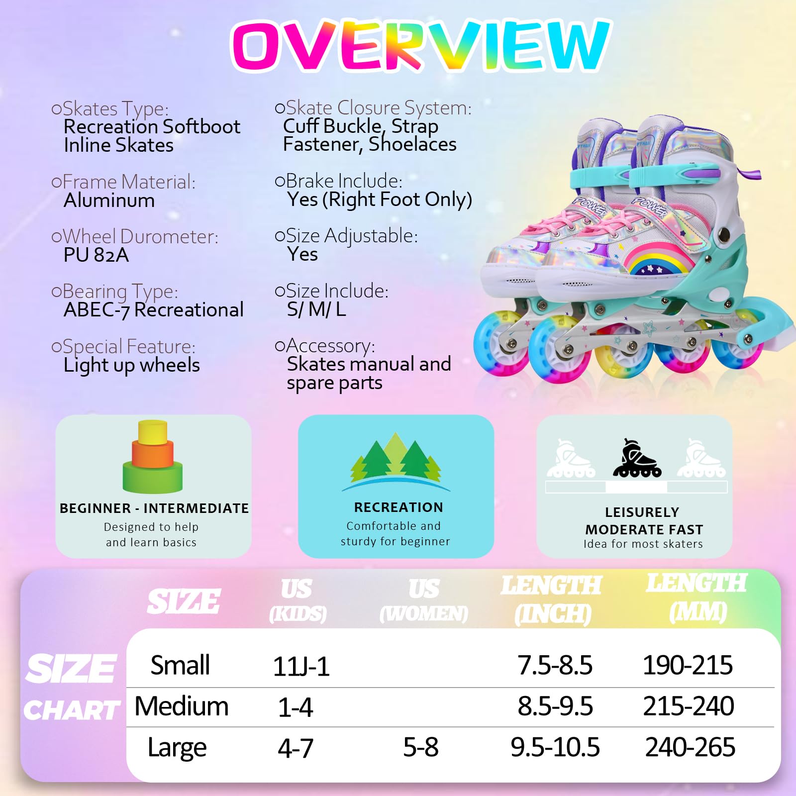 Adjustable Inline Skates for Kids Girls Children Beginners, Rainbow Inline Roller Skates with Light Up Wheels for Kids and Youth for Sports (Small)