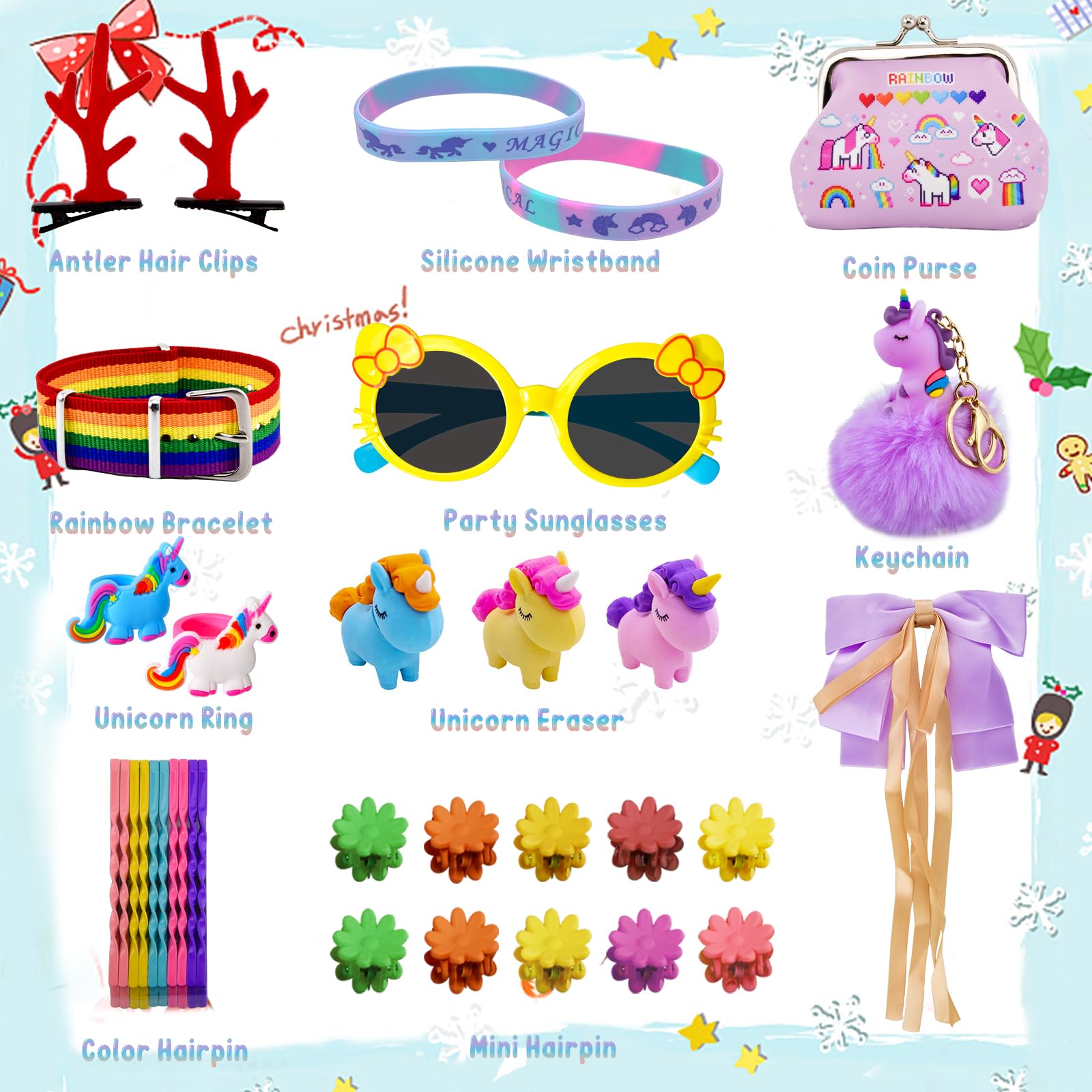 - 2025 Advent Calendar - This Christmas Fashion Accessories set has 24pcs christmas countdown surprising gifts include coin purse , silicone wristband, unicorn rings, necklace, hair clips, hair accessory, bracelet, stickers, mini mirror etc.