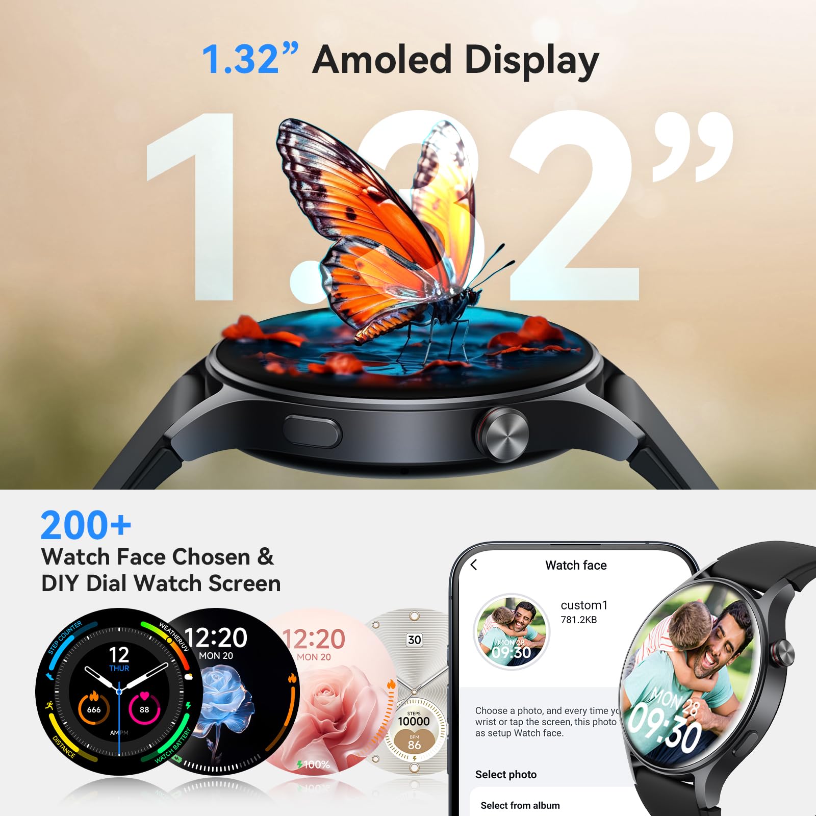 - 【1.32" AMOLED Touchscreen】Display offers sharp visuals and smooth responsiveness. Choose from 200+ watch faces or personalize with your own photos, making the watch uniquely yours.