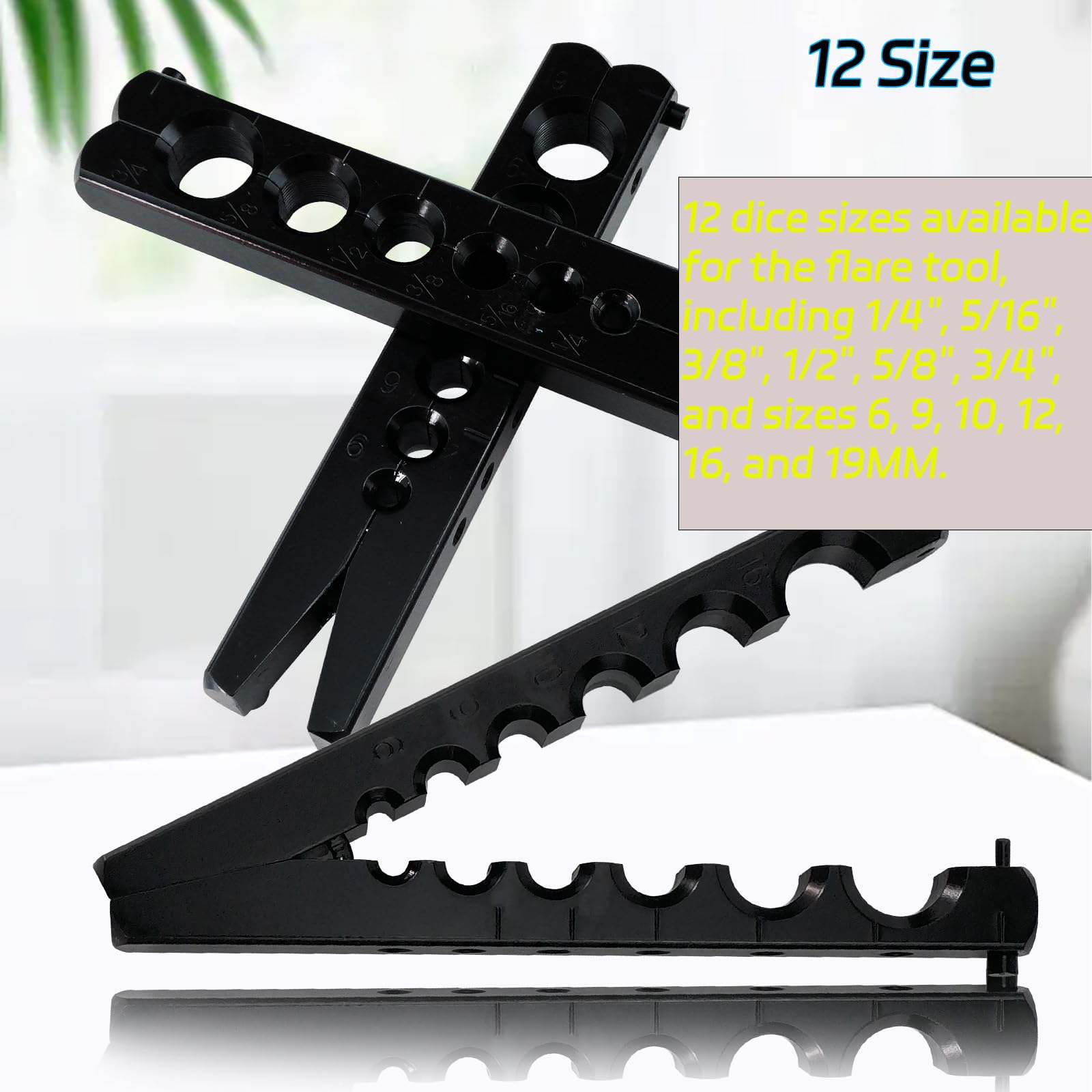 - Available Sizes : There are 12 dice sizes available for the flare tool, including 1/4", 5/16", 3/8", 1/2", 5/8", 3/4", and sizes 6, 9, 10, 12, 16, and 19MM