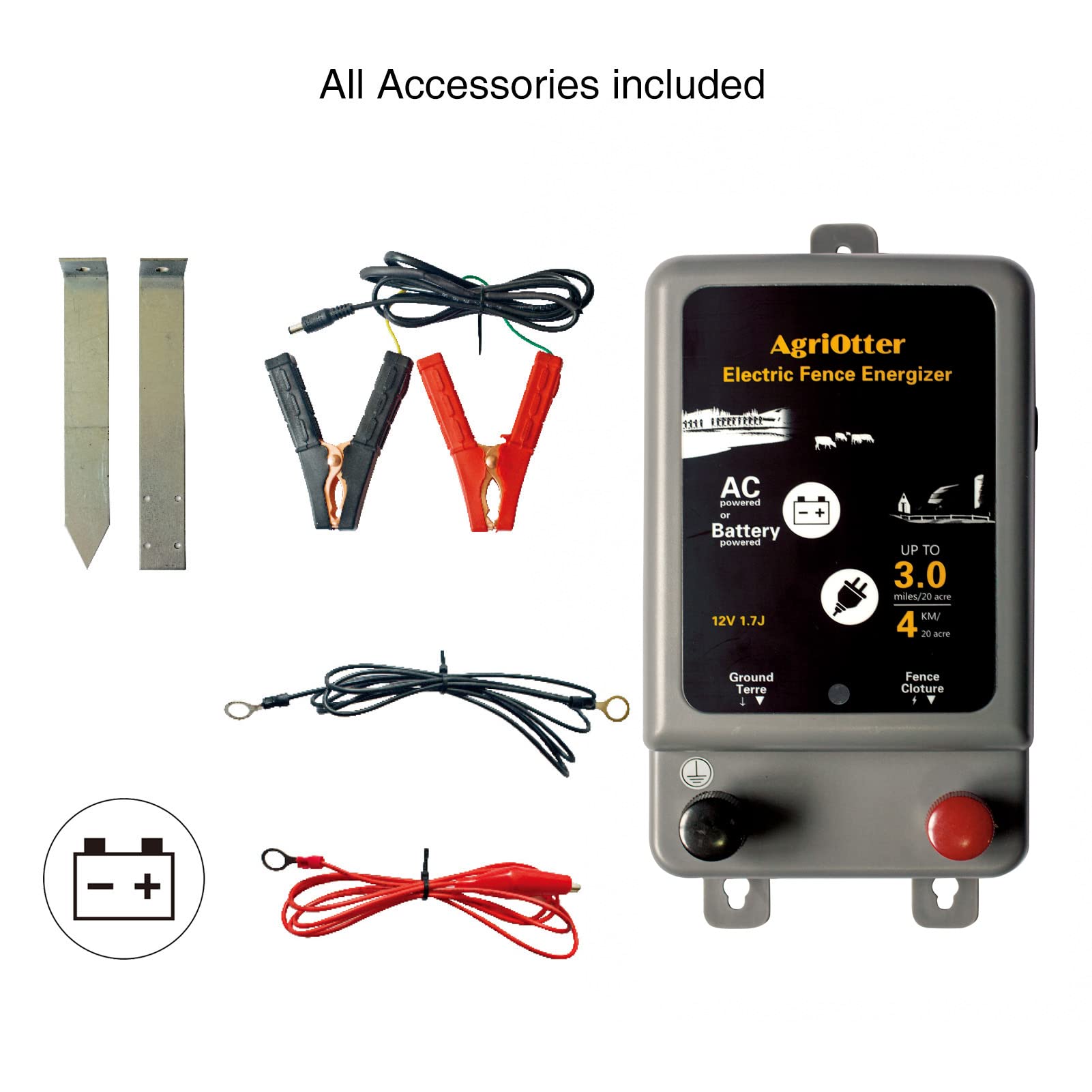 Details: AgriOtter Electric Fence Energizer 15 Acre 2 in 1 Powered by Battery or AC Outlet 8000V 1.75J Pulse Electric
